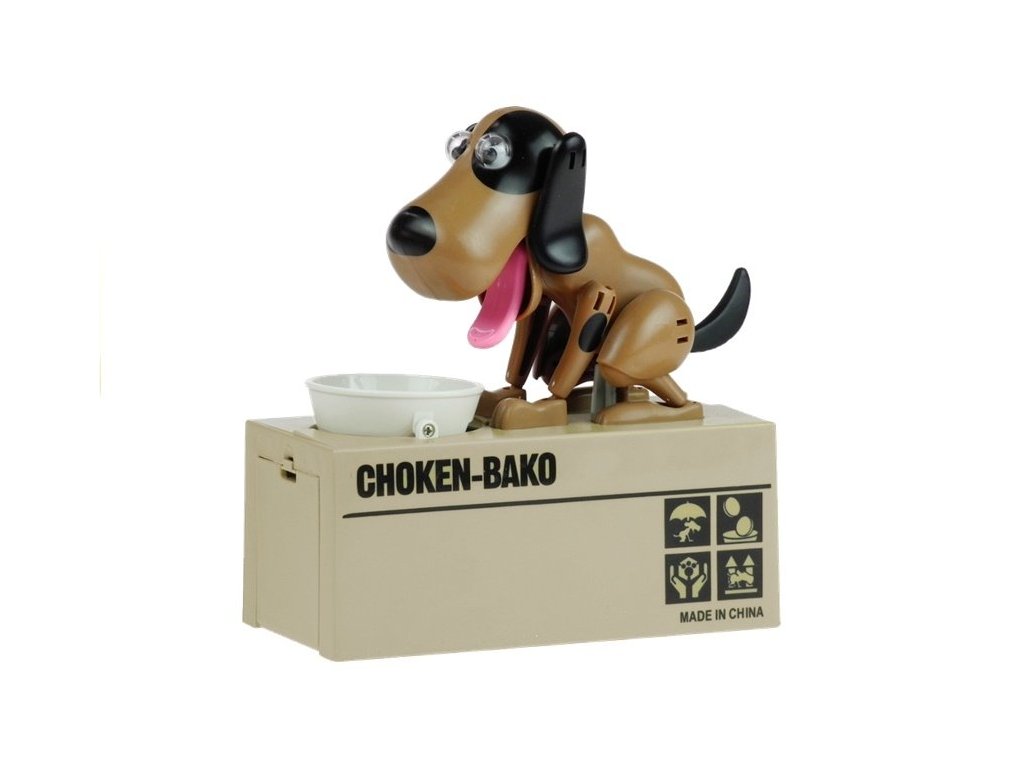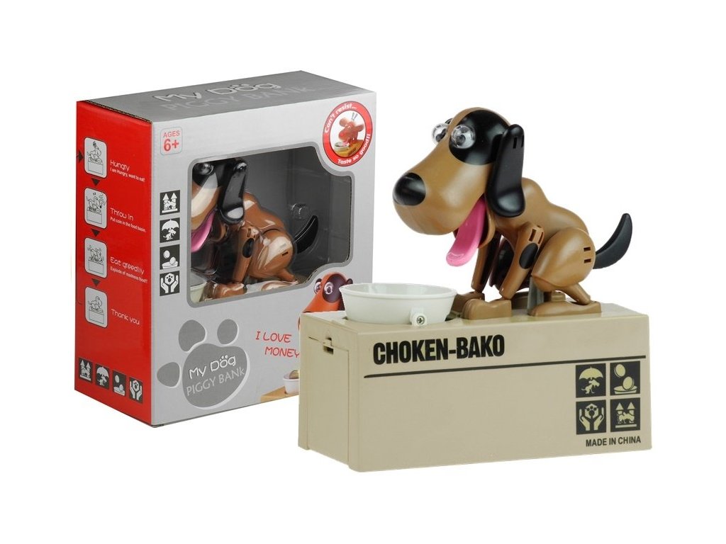 Tato senzační pokladnička se skládá z velké krabice, která je zásobníkem na dětské peníze, pohyblivé misky s otvorem na mince a energického pejska, který pohybuje očima, ušima, jazykem a ocasem a zároveň vydává zvuky.