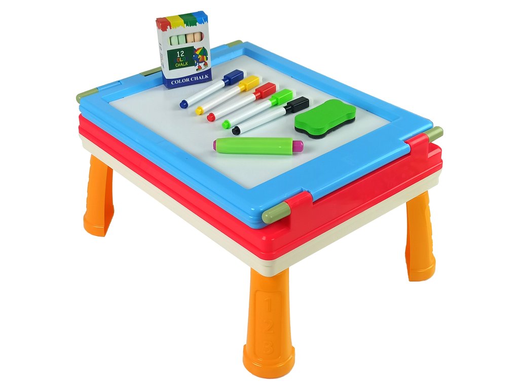 Spousta výhod, ale jeden výrobek. Tabule má dvě kreslicí plochy - bílou pro použití stíratelných fixů a černou pro použití kříd - a dodává se s fixy v černé, modré, červené, zelené a žluté barvě. Také se sadou 12 kusů kříd.