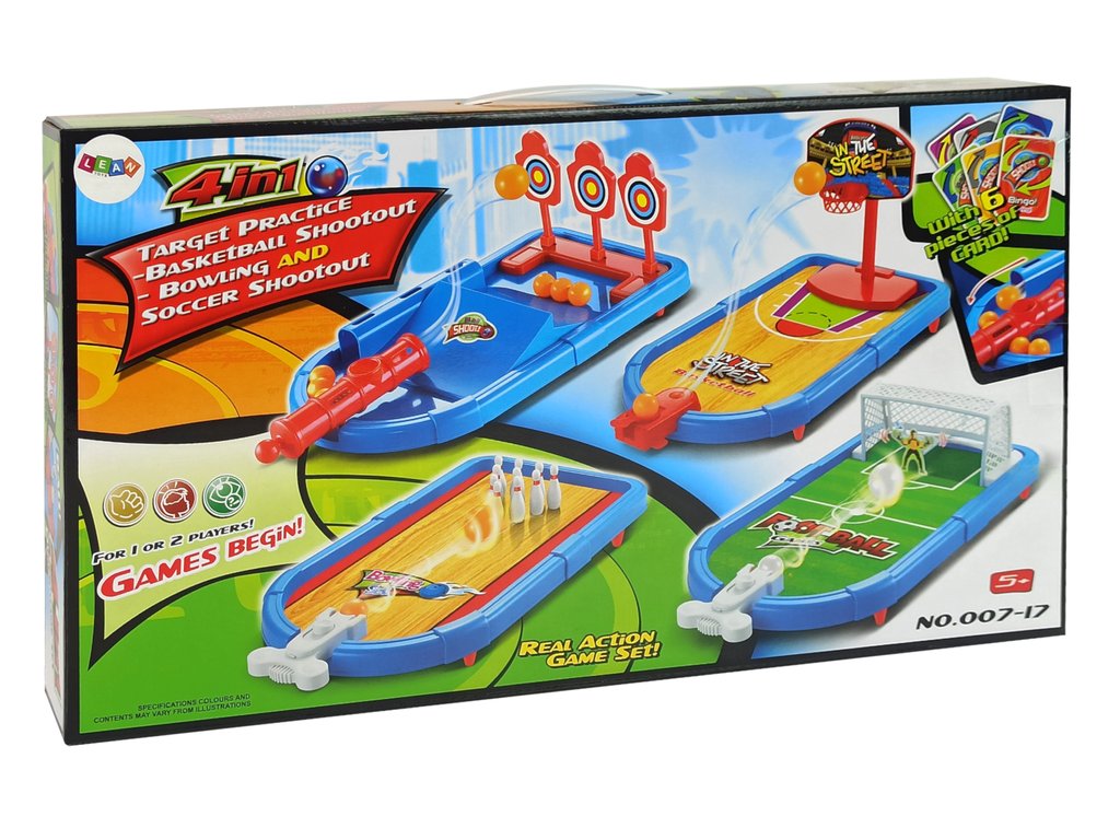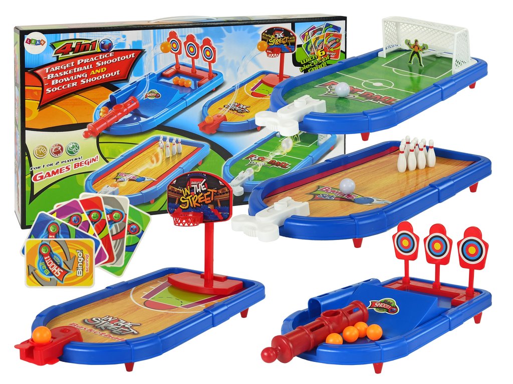Stolní hra sporty 4v1 je herní sada, která se skládá z basketbalového koše, fotbalové branky, kuželek a střelby na terč. Tato hra je skvělou volbou pro vaše dítě, které bude moci trávit svůj volný čas zajímavým způsobem. Stolní verze oblíbených sportovních her povzbudí rodinu a přátele ke hře. Během soutěže děti rozvinou přesnost, preciznost a naučí se férové soutěživosti.