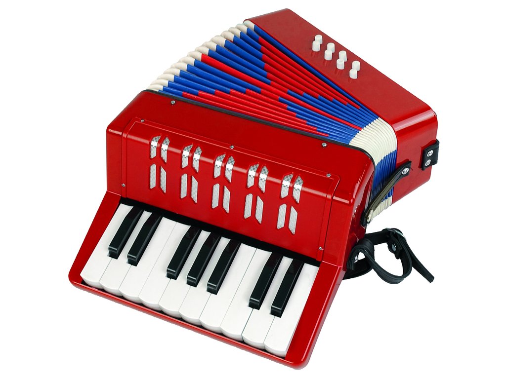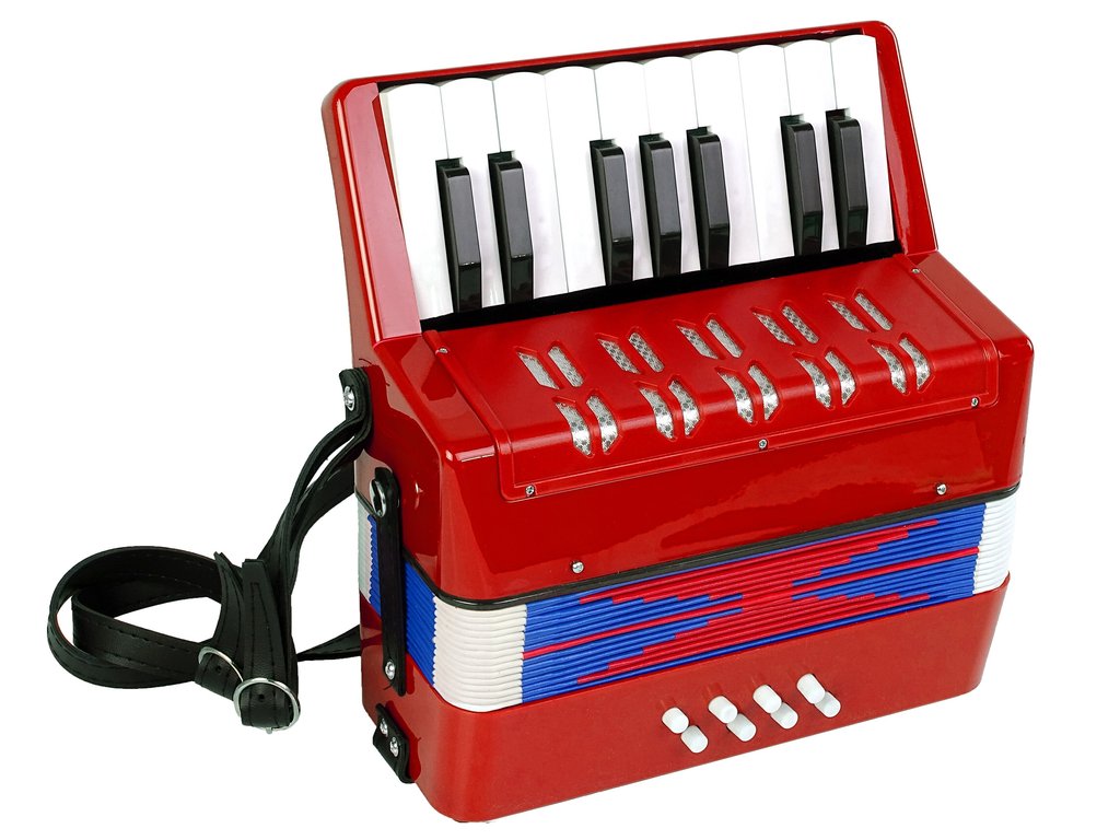 Akordeon hudební nástroj pro děti v červené barvě. Hudební akordeon je fantastická hračka pro děti, které mají rády hudbu a zábavu. Hudba uvolňuje a dává vám dobrou náladu! Nástroj vypadá jako skutečná věc a zní velmi dobře.