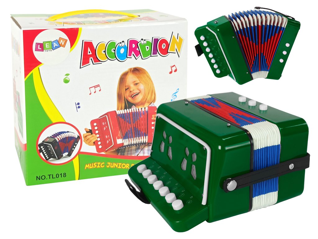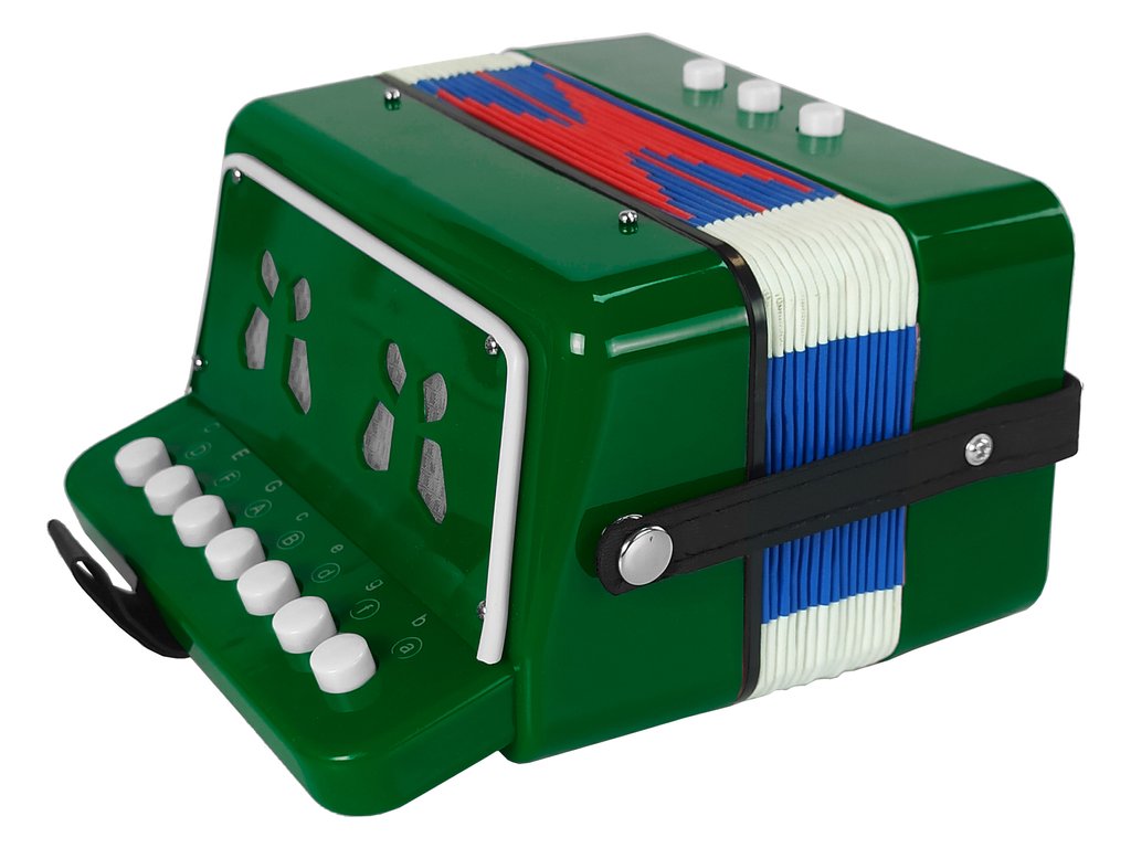 Akordeon je fantastická hračka pro děti, které mají rády hudbu a zábavu. Nástroj vypadá jako skutečný. Dokonale rozvíjí dětskou motoriku a sluch a zároveň dítě připraví na hru na skutečný nástroj. Princip harmoniky je stejný jako u skutečného nástroje, k vydání zvuku je třeba harmoniku rozbalit a složit, má basové a zvukové tlačítko a rukojeť.