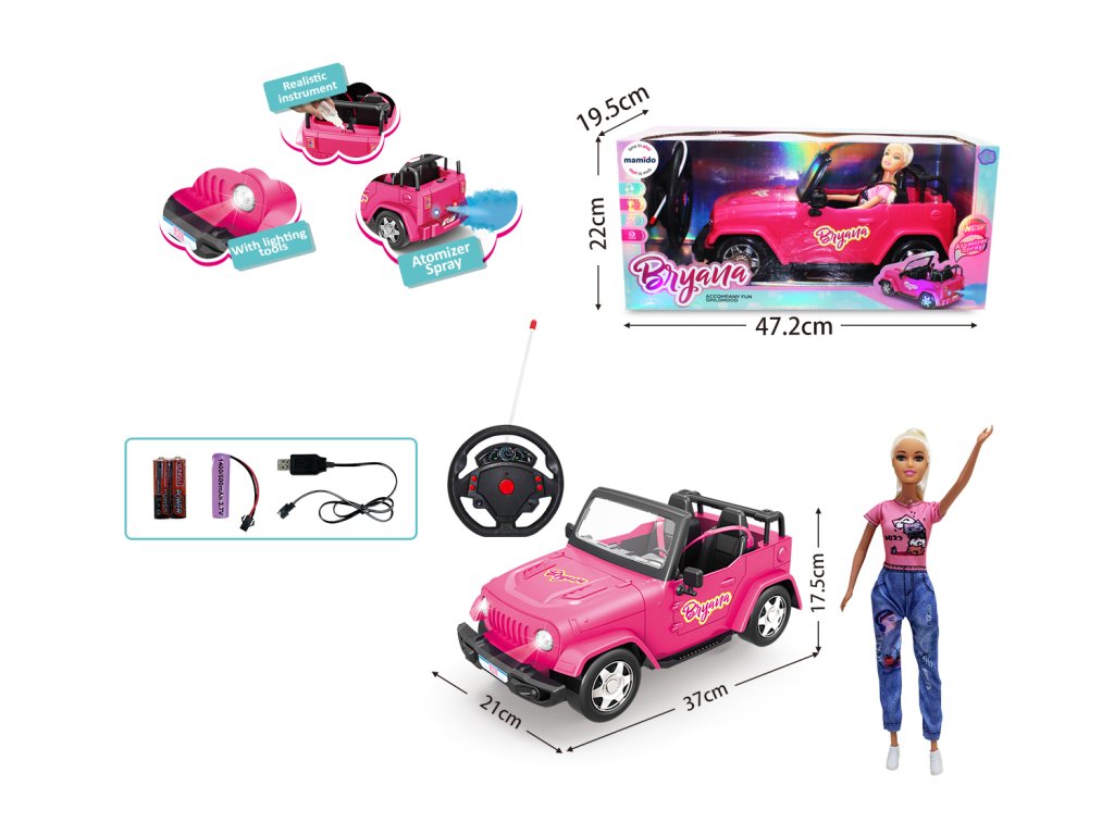 Stylový růžový kabriolet na dálkové ovládání potěší každou malou milovnici panenek. Auto je dodáváno spolu s panenkou Bryana, která může řídit přímo ze sedadla řidiče. Vozidlo se ovládá pomocí volantového dálkového ovladače, zvládá jízdu vpřed, vzad i zatáčení.