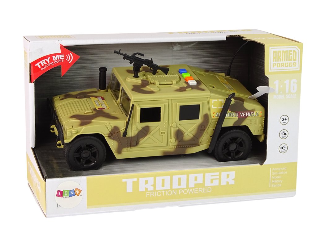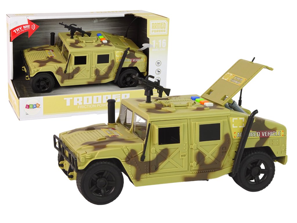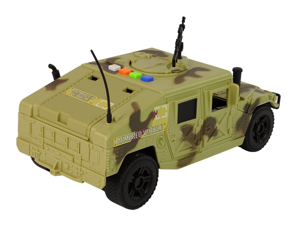 Vojenské autíčko má válečné barevné schéma, širokou karoserii a zbraň na střeše, která napodobuje skutečný model.