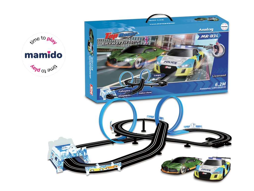 Zažijte napínavé závody s autodráhou Top Racer o délce 6,2 metru, která přináší akci přímo do vašeho obýváku! V balení najdete dva detailně zpracované vozy – sportovní auto a policejní vůz, takže se můžete pustit do pořádné policejní honičky.