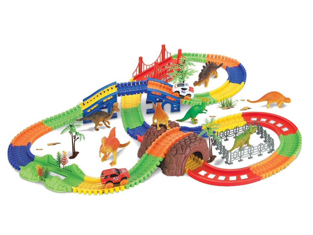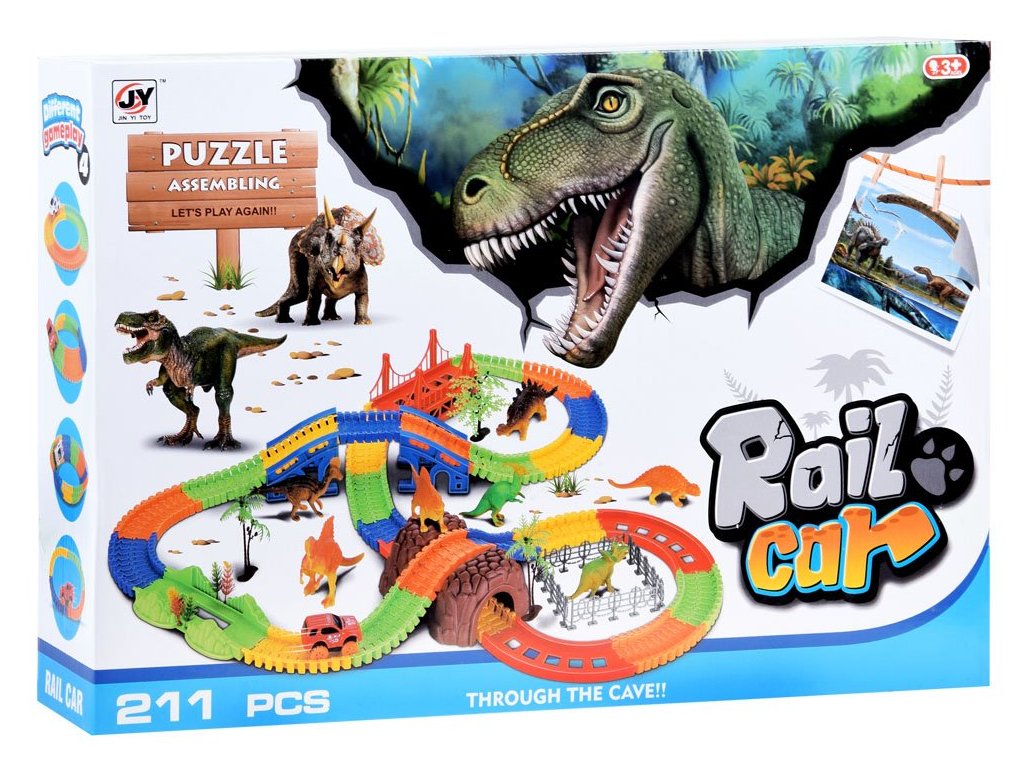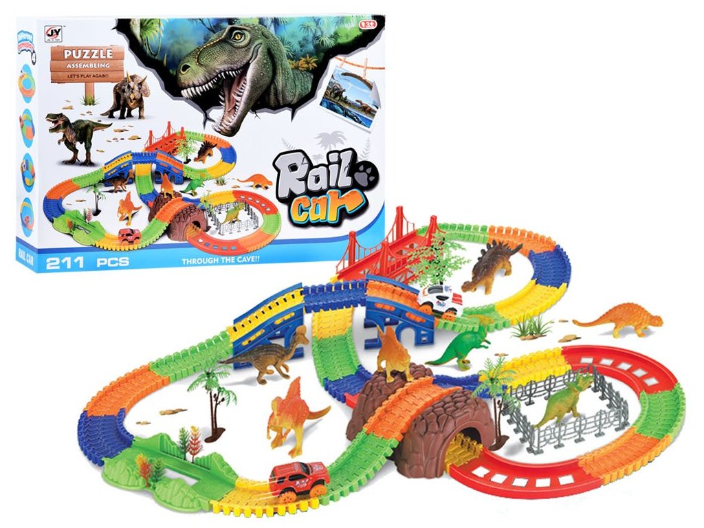 Autodráha s dinosaury je bohatě vybavena, skládá se celkem z 211 elementů. Díly dráhy můžete multifunkčně skládat.
