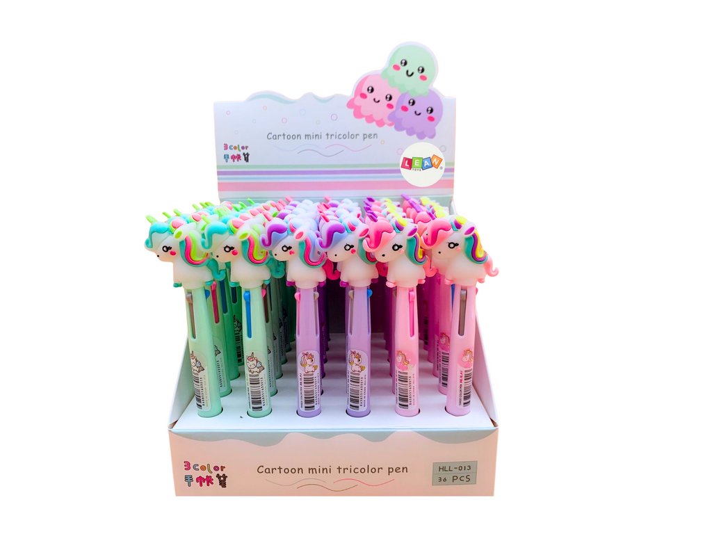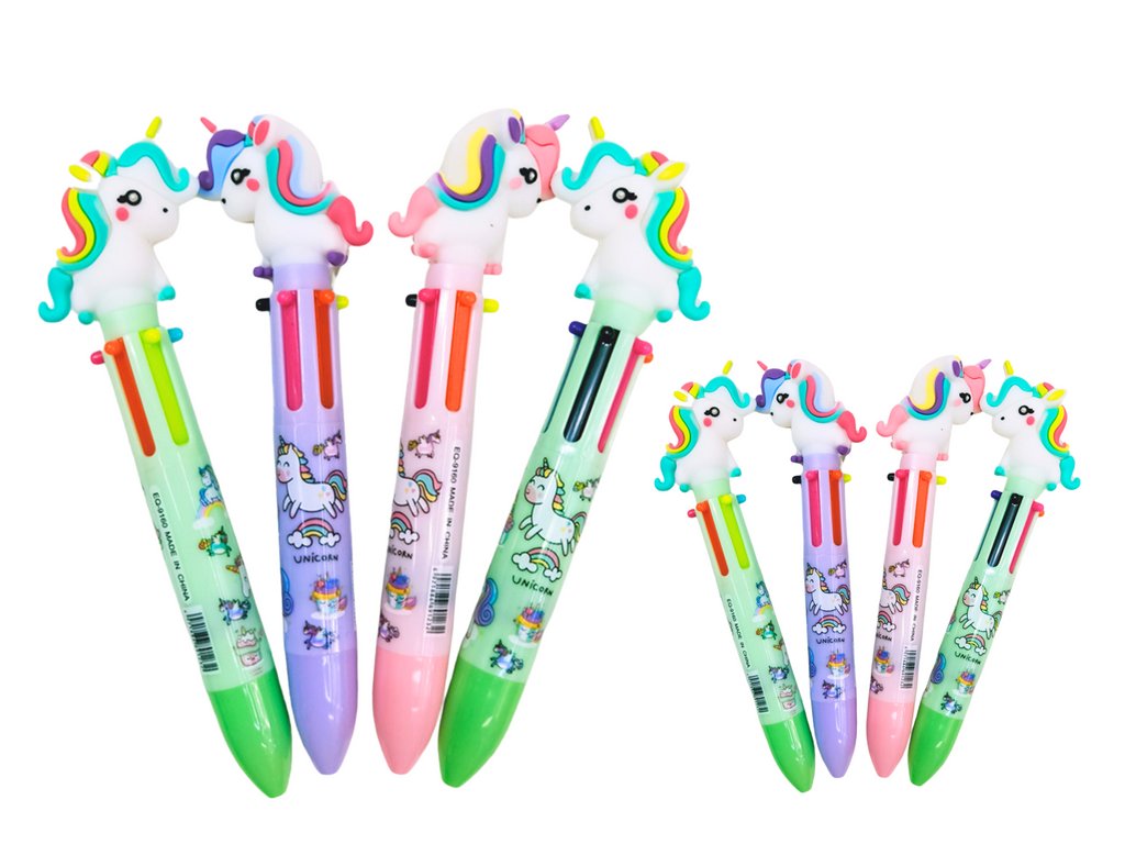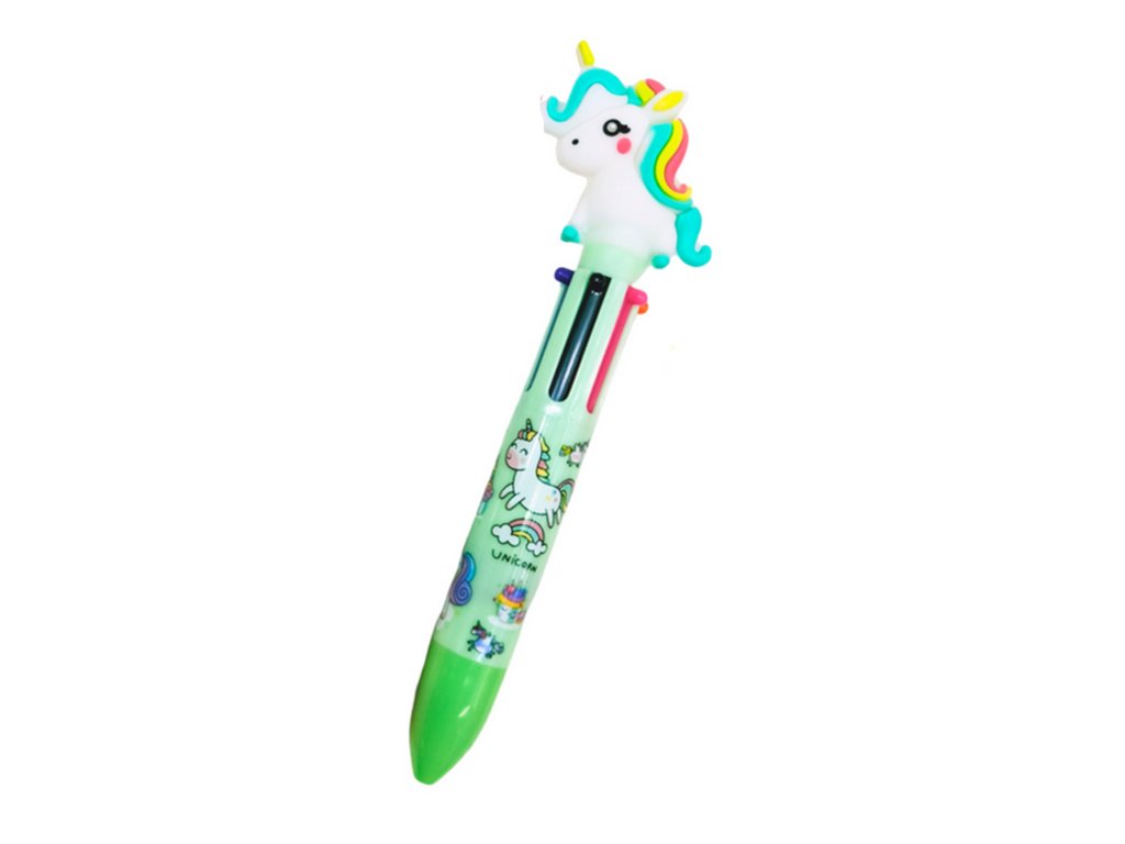 Tato multifunkční propiska s motivem jednorožce kombinuje zábavu s praktičností. Díky snadnému přepínání barev umožňuje rychlé střídání pro kreslení nebo psaní, což dětem usnadňuje a zpříjemňuje práci. Půvabný jednorožec na těle propisky dodává každodenním činnostem kouzlo, a zároveň povzbuzuje zájem o psaní a kreativitu.