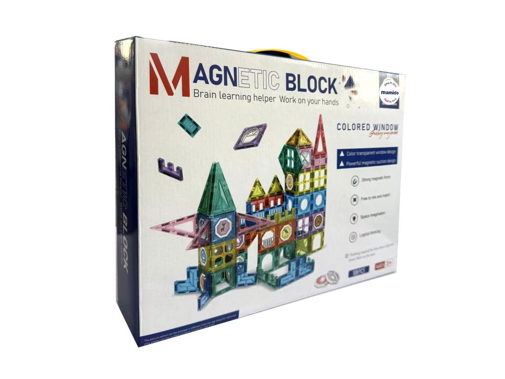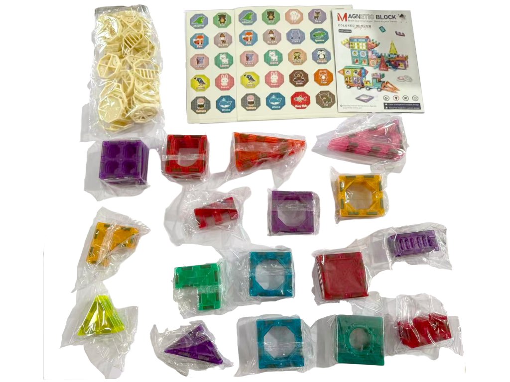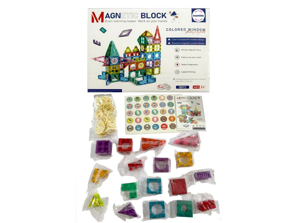 Stavebnice obsahuje 108 magnetických dílků různých tvarů – trojúhelníky, čtverce, oblouky, dlouhé panely, dekorativní okénka i speciální díly. Transparentní provedení v zářivých barvách podporuje vizuální vnímání a díky jednoduchému spojování si s ní poradí i menší děti. Ideální pro rozvoj kreativity, logického myšlení a prostorové představivosti.
