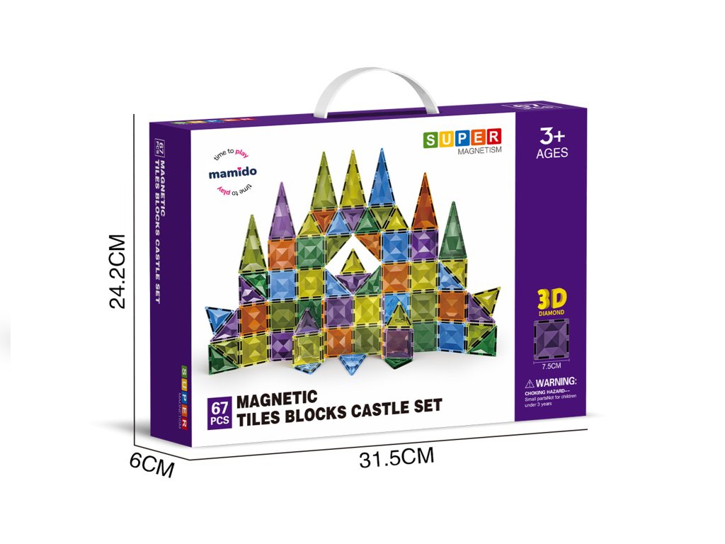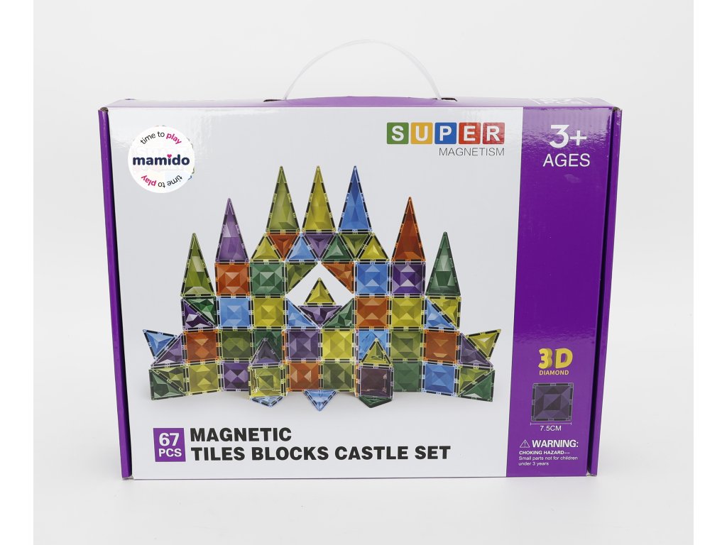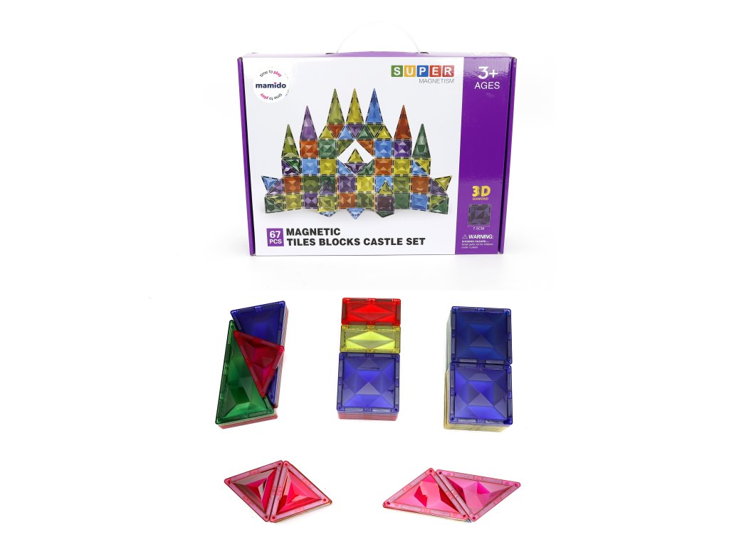 Sada nabízí 67 magnetických dílků ve velikosti 7,5 cm, které se díky silným magnetům snadno spojují a umožňují stavět jak jednoduché, tak rozsáhlejší 3D konstrukce. Různé tvary a barvy podporují rozvoj představivosti a jemné motoriky. Stavebnice je kompatibilní s většinou běžných magnetických panelů, takže ji lze snadno rozšiřovat.