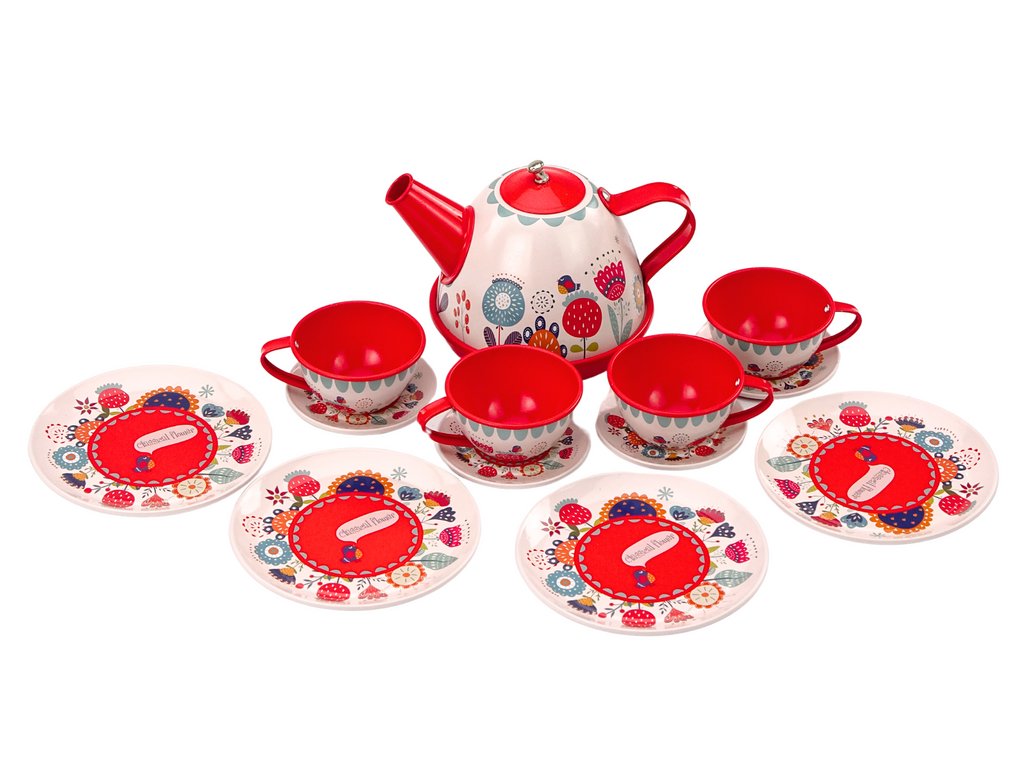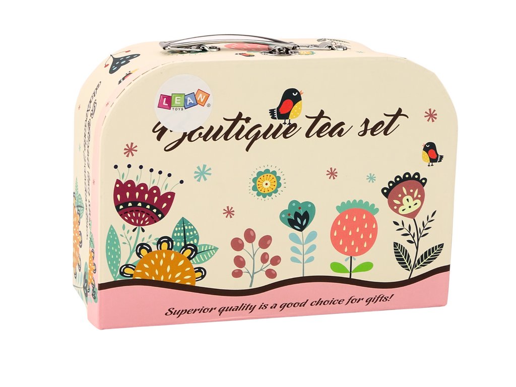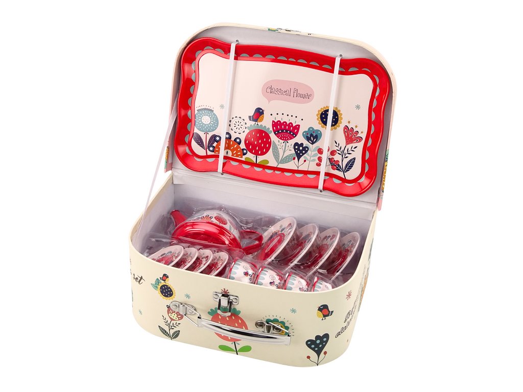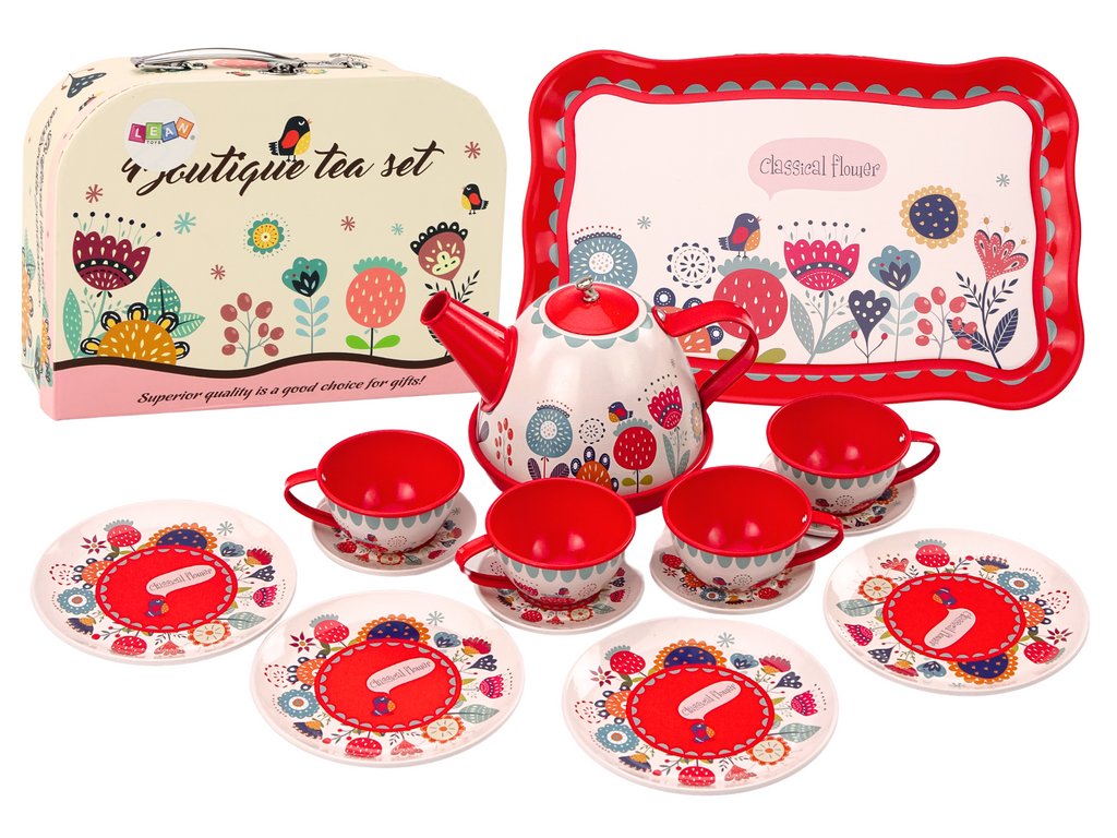 Čajová a kávová sada v kufříku, talířky a šálky červené