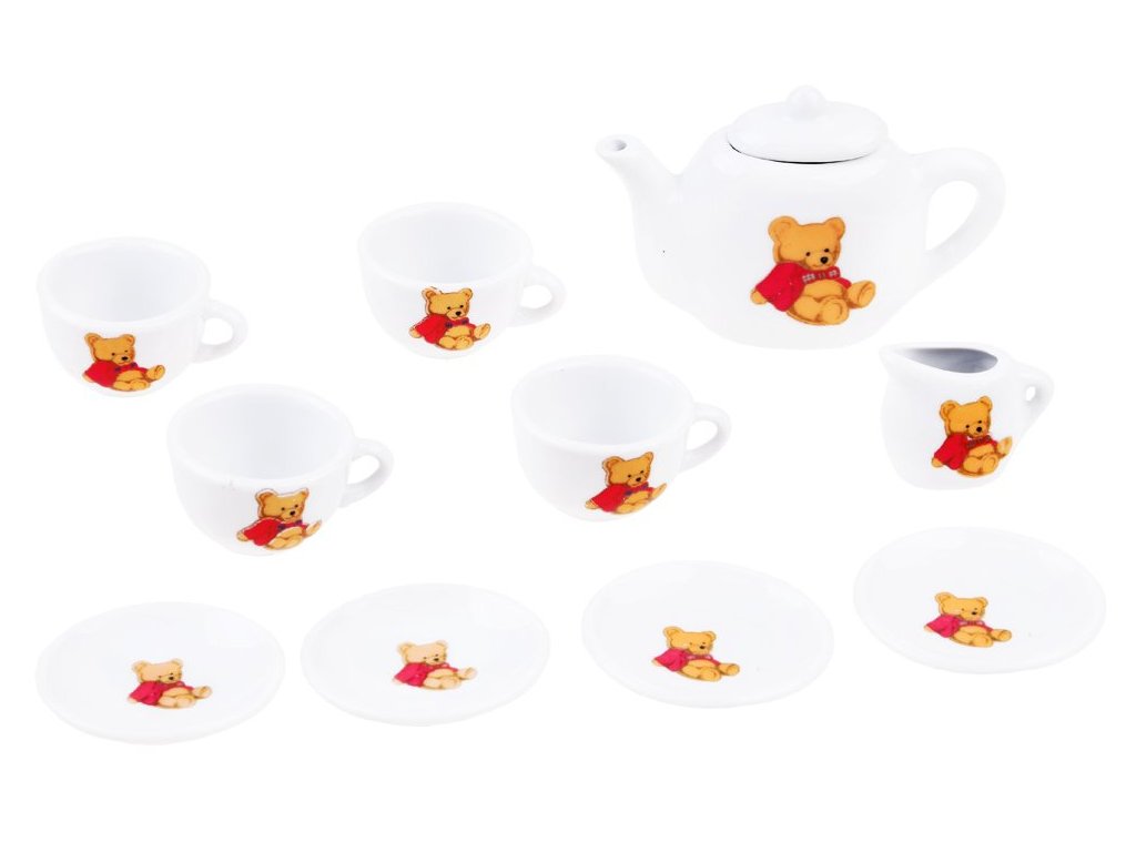 Šálky a talířky jsou bílé a zdobené krásnou rodinou medvídků.
