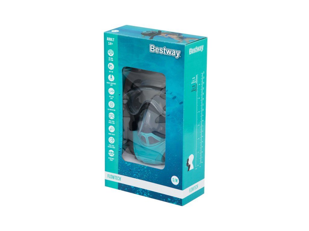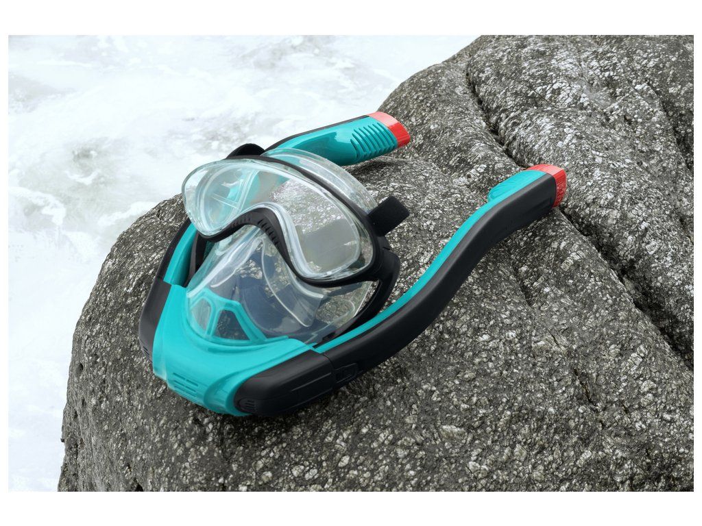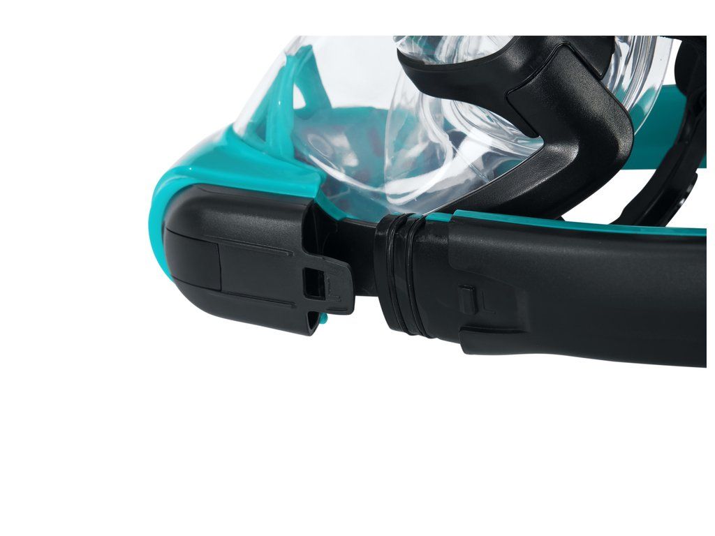 Tento inovativní design masky a šnorchlu nové generace umožňuje přirozené dýchání nosem a ústy ve vodě. Vdechujete čerstvý vzduch jedním šnorchlem a druhým vydechujete CO2 díky technologii jednosměrného proudění vzduchu. Měkká, silikonová konstrukce pokrývající celou tvář pohodlně a bezpečně přiléhá na hlavu, umožňuje přirozené dýchání nosem a ústy a zároveň vyrovnává tlak při sestupu a výstupu z vody. Pokročilá technologie suchého šnorchlu zabraňuje vniknutí vody do masky, když je ponořená. V horní části šnorchlu je malé plovoucí zařízení, díky kterému můžete potápět pod vodou bez obav, že by se voda dostala do dýchacího prostoru. Pokud se stane, že se voda dostane do šnorchlu, je tu vypouštěcí ventil, který usnadňuje čištění.