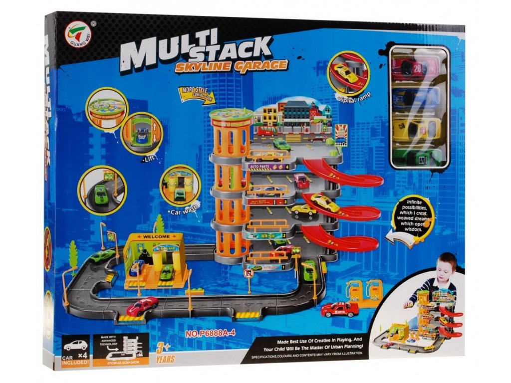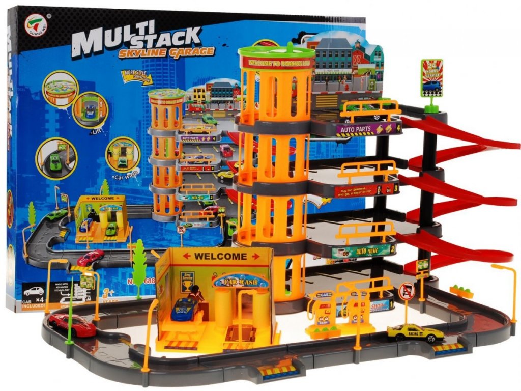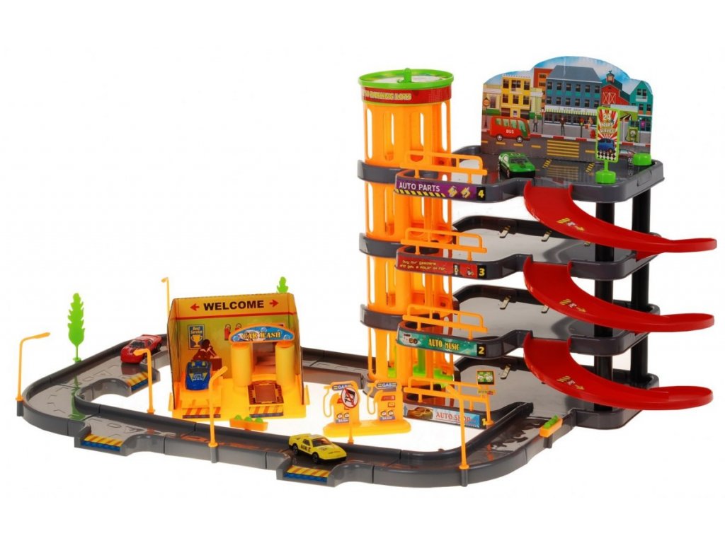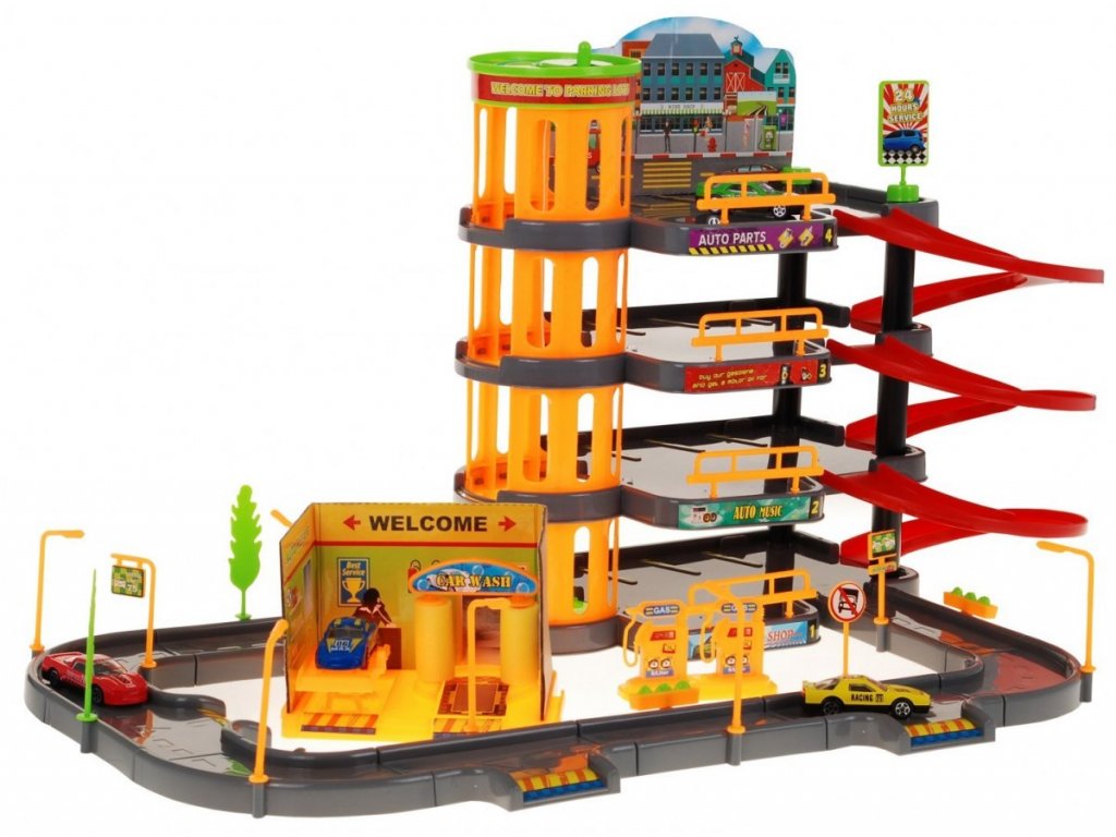 Dalšími atrakcemi jsou benzínová pumpa a myčka. Stav vozidla můžete zkontrolovat díky zvednuté plošině – výtahu. Celá sada je vyrobena z vysoce kvalitního plastu, snadno se sklopí, splňuje požadavky našich malých konstruktérů.