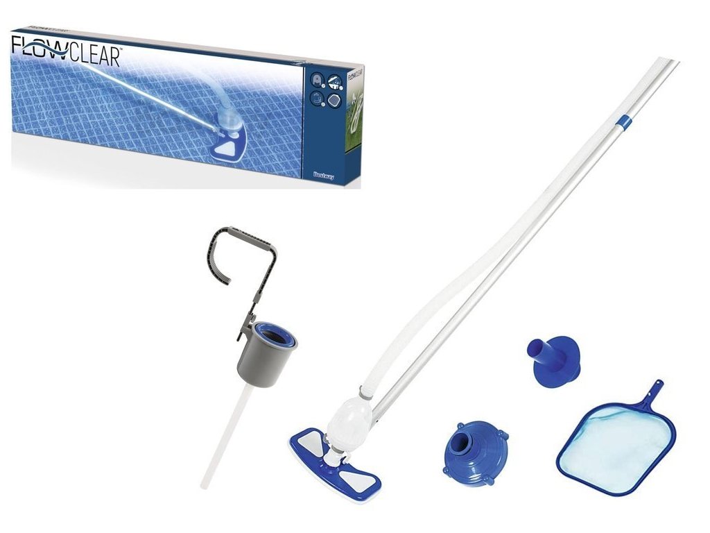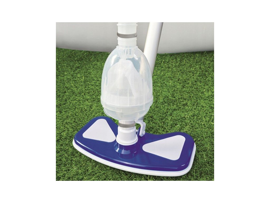 Díky této sadě bude voda ve vašem bazénu vždy čistá. Základním prvkem sady je vysavač se speciálním hrotem, který při připojení k filtračnímu čerpadlu účinně odstraňuje nečistoty z bazénu. Velmi užitečným prvkem při čištění bazénu je také síť pro zachycení větších nečistot z povrchu bazénu.