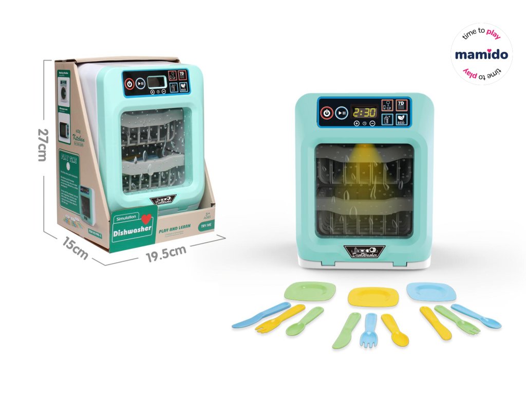 Součástí je sada talířků, lžiček i vidliček, takže je možné mytí ihned vyzkoušet. Ideální hračka pro malé kuchařky a kuchaře, podporující kreativní hraní a představivost. Hračka je napájena třemi bateriemi 1,5V AA. Hračka je vhodná pro děti od 3 let.