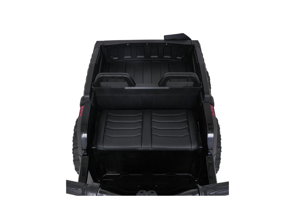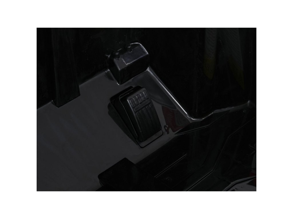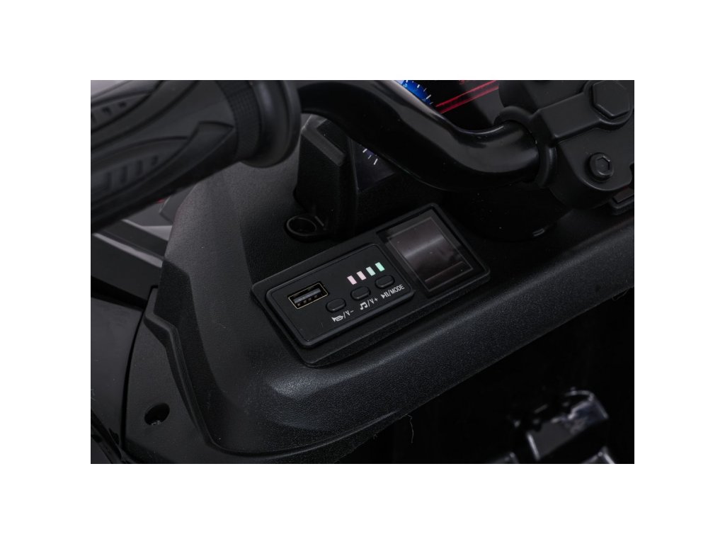 Součástí výbavy jsou také přední LED světla, otevíratelné dveře a prostorný kufr o rozměrech 42 x 28 x 10 cm. Hudební panel nabízí MP3 přehrávač, Bluetooth, USB vstup a tlačítka s melodiemi a klaksonem přímo na volantu. Indikátor nabití baterie umožní mít neustále přehled o stavu vozítka.