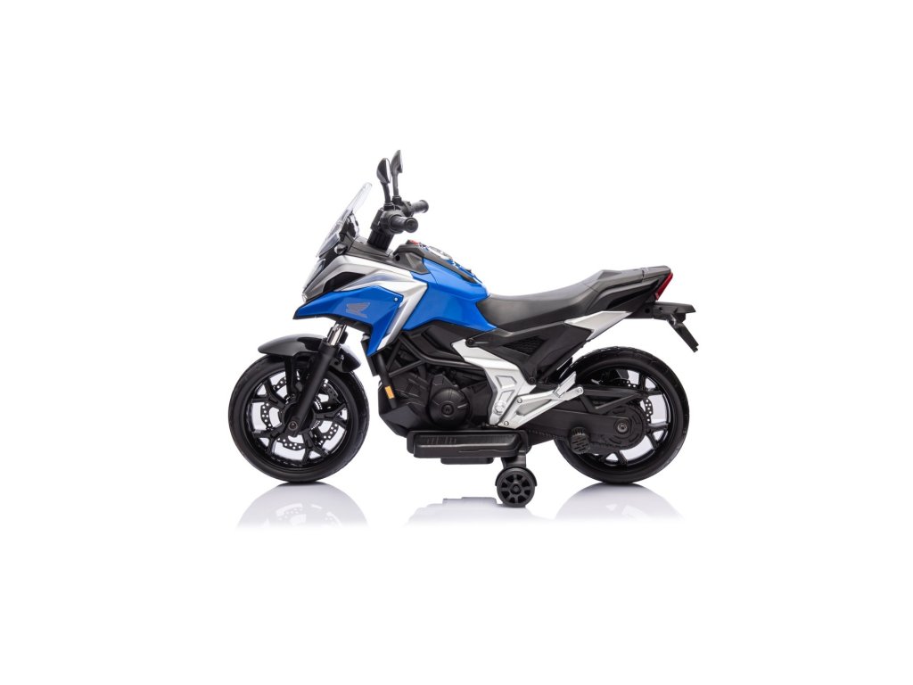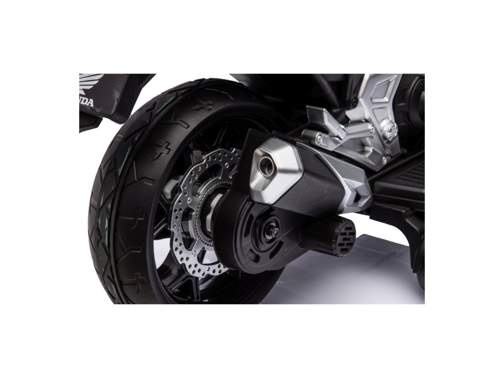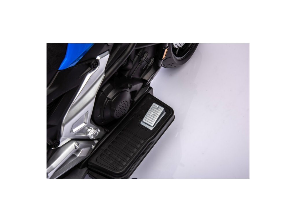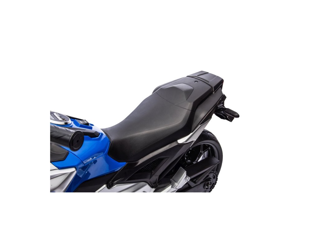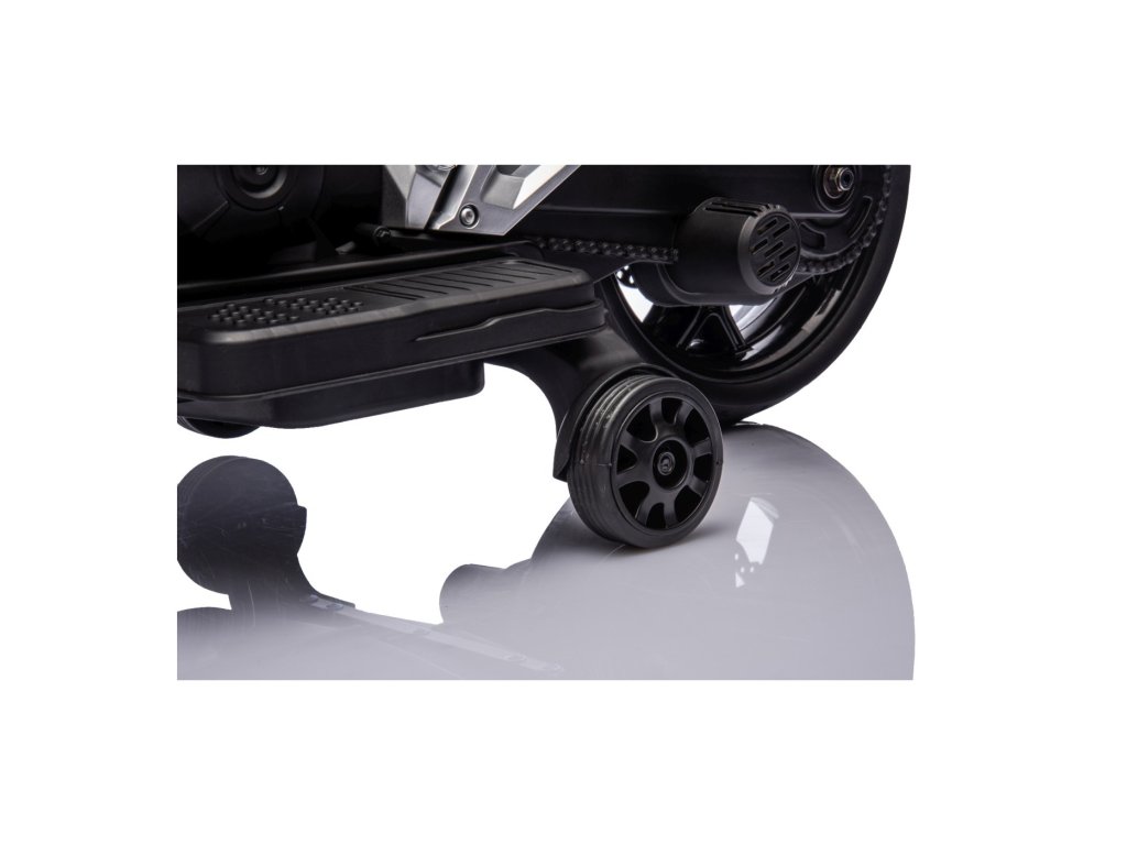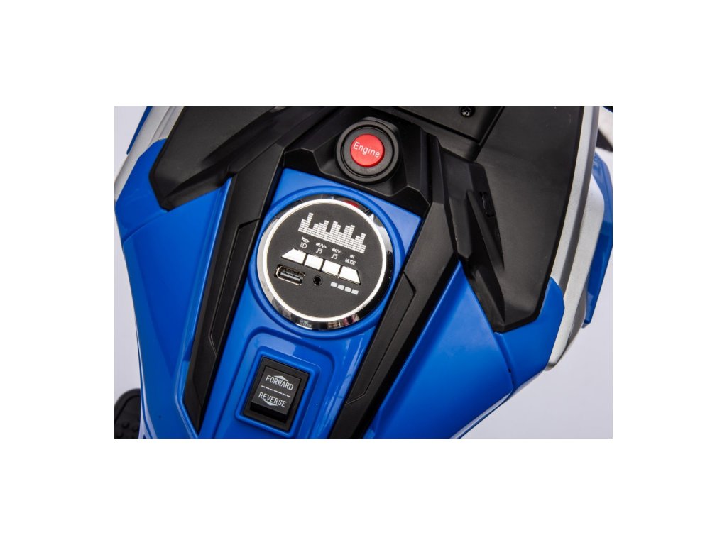 Dětská elektrická motorka má plastová kola s gumovým lemem a motor o výkonu 70W. Mezi vybavení patří přední LED světla a hudební panel s Bluetooth, AUX, MP3, USB a předem nahranými melodiemi.