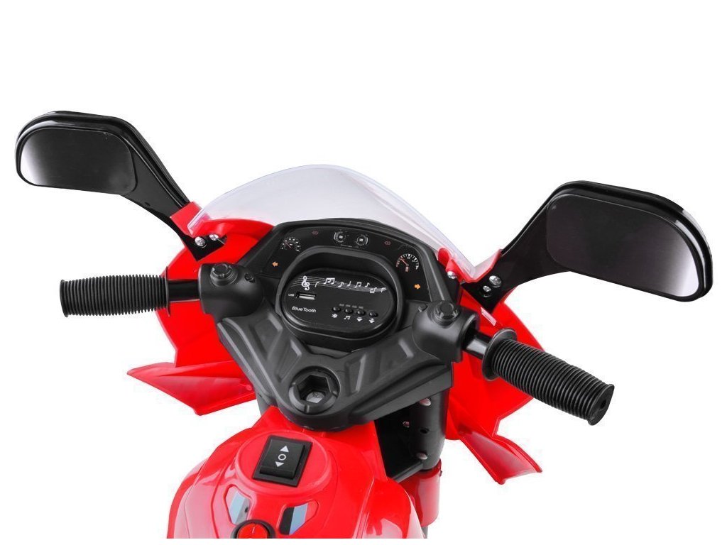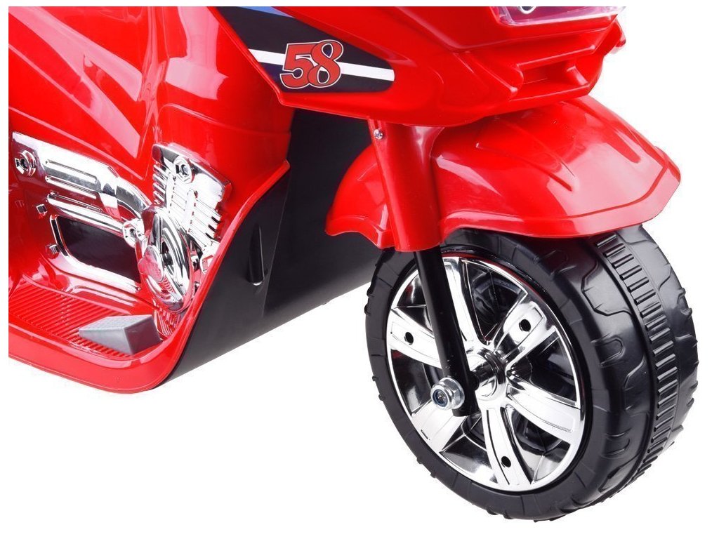 Dětská elektrická motorka R58 se pyšní bohatým vybavením a zajímavými svítícími efekty. Po vložení baterií do disků se kola motorky rozsvítí. Hudební panel je vybaven USB vstupem. V zadní části motorky se nachází zavazadlový prostor, kde si dítě může uschovat své poklady.