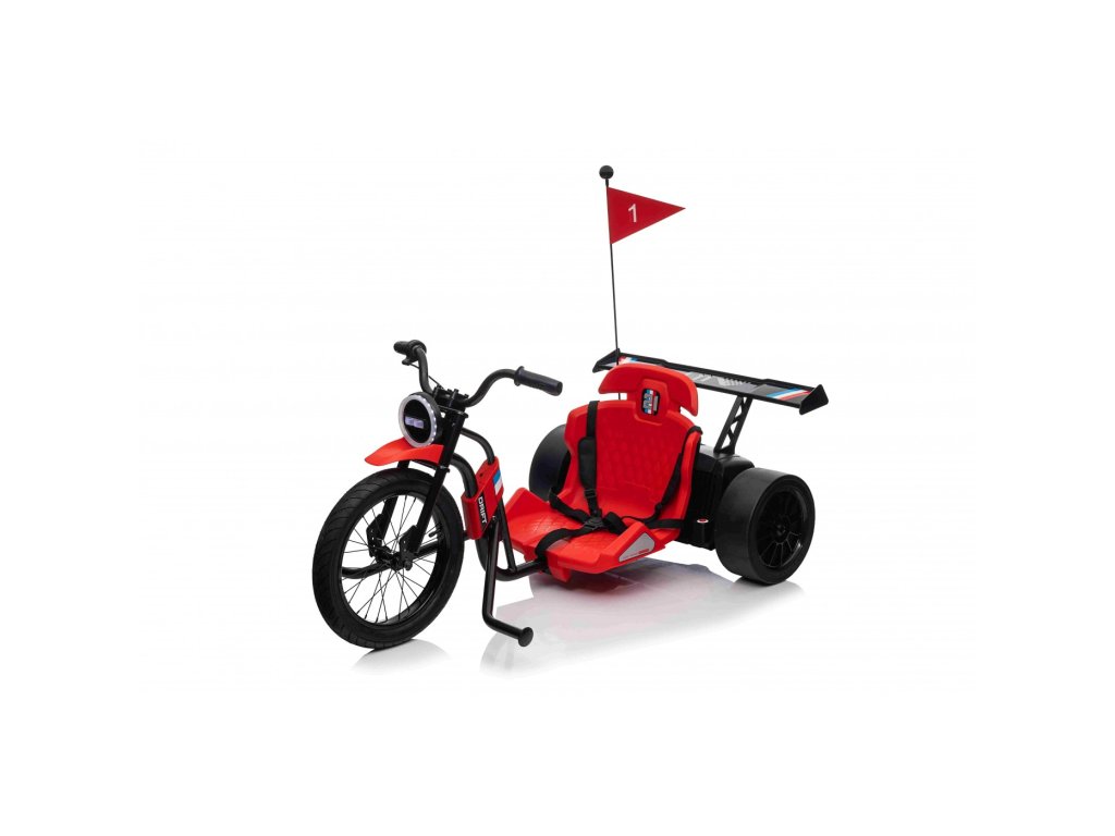 Dětská elektrická driftovací tříkolka s bateriemi o kapacitě 2 x 12V 10Ah a dvěma motory 25000RPM uspokojí potřeby i větších dětí, protože nosnost vozítka je 70 kg. Tříkolka je vybavena sportovní tvarovanou sedačku s bezpečnostními pásy a předními LED světly.