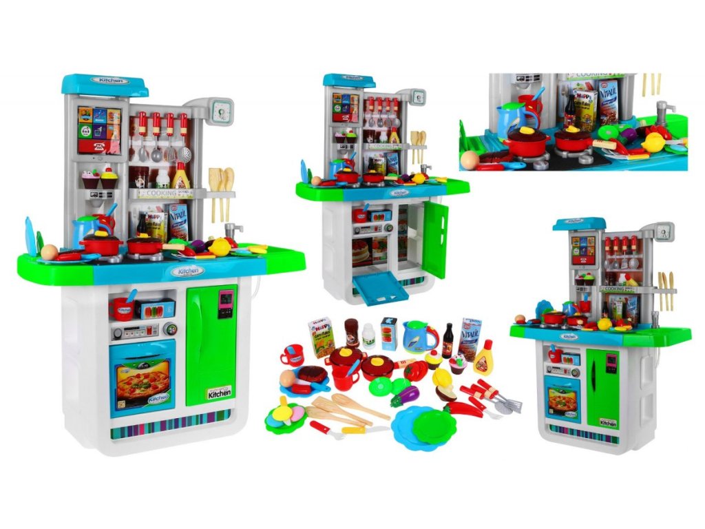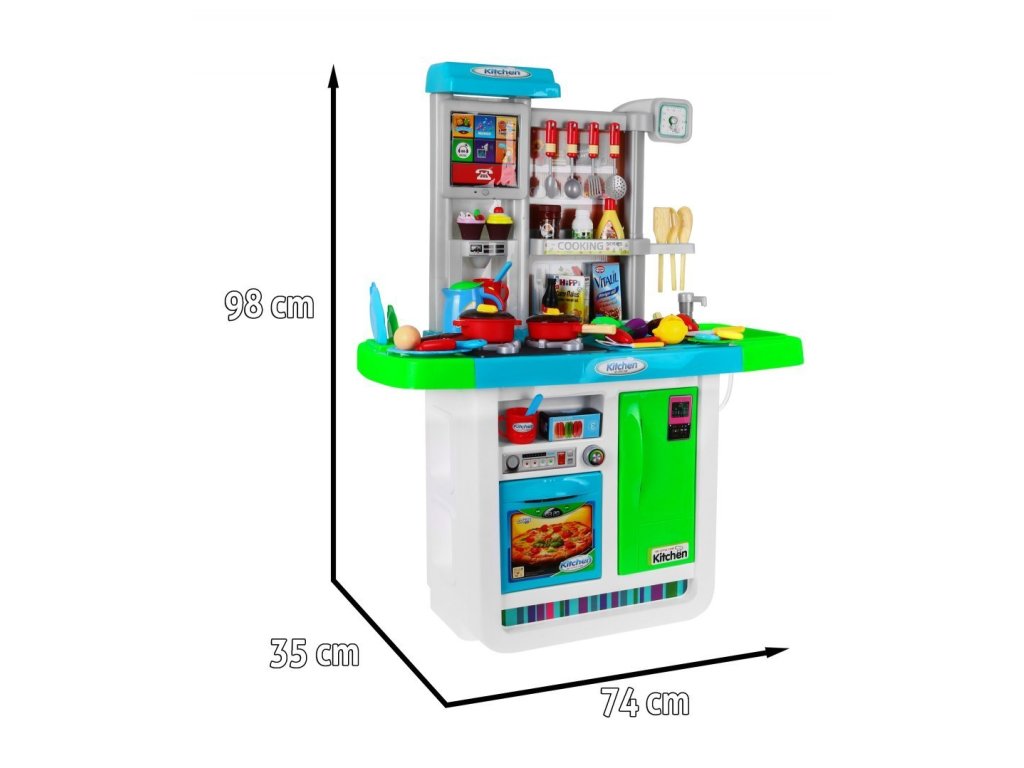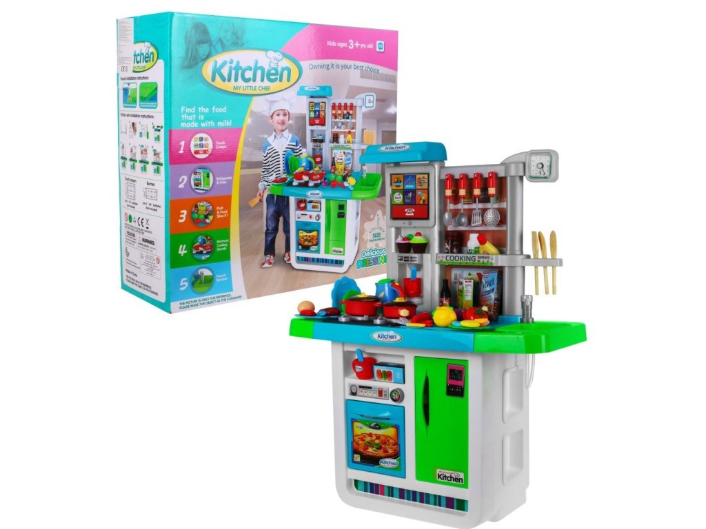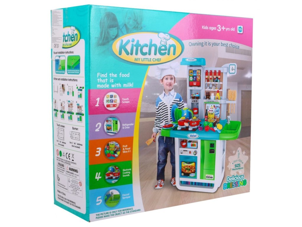 Představujeme Vám multifunkční dětskou kuchyňku, která je plně vybavená. Kuchyňka má kohoutek s tekoucí vodou, 2 hořáky, lednici a troubu s otevíratelnými dvířky. Kuchyňka v době vaření má světelné a zvukové efekty. Dále se v sadě nachází kompletní nádobí a potraviny, které se Vám při vaření budou jistě hodit. Další výhodou je dotykový panel zabudovaný do kuchyně. Dotykový panel se po 1 minutě nečinnosti sám vypne, což šetří životnost baterie. Kuchyňka byla velice pečlivě vyrobená z kvalitního plastu. Vhodná věková kategorie od 3+ let. Výrobek má evropský certifikát bezpečnosti CE.