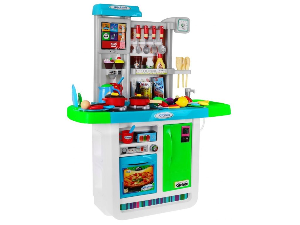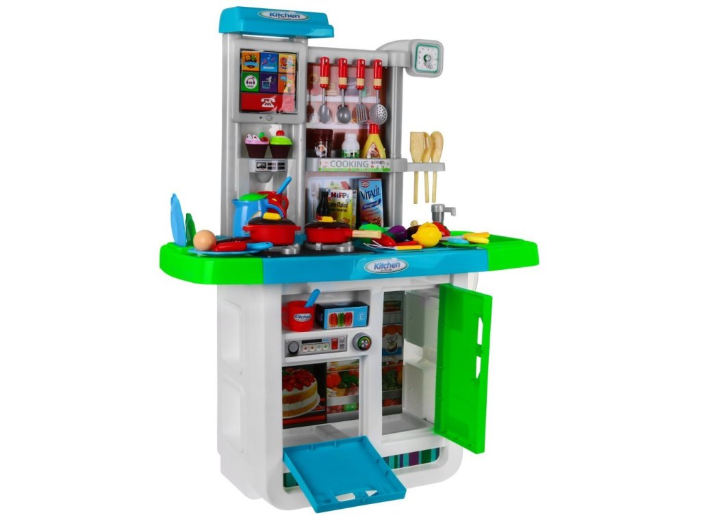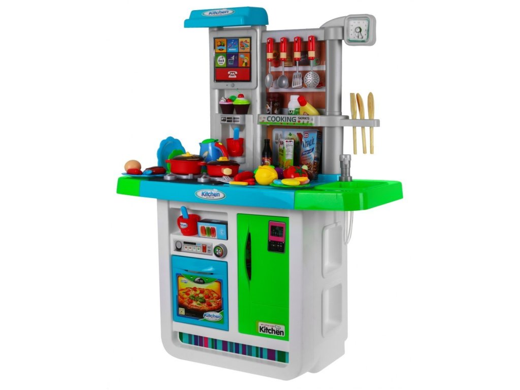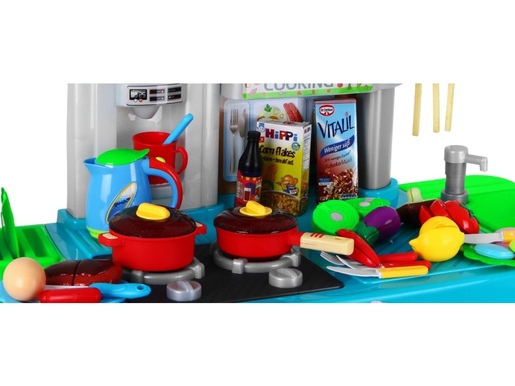 Představujeme Vám multifunkční dětskou kuchyňku, která je plně vybavená. Kuchyňka má kohoutek s tekoucí vodou, 2 hořáky, lednici a troubu s otevíratelnými dvířky. Kuchyňka v době vaření má světelné a zvukové efekty. Dále se v sadě nachází kompletní nádobí a potraviny, které se Vám při vaření budou jistě hodit. Další výhodou je dotykový panel zabudovaný do kuchyně. Dotykový panel se po 1 minutě nečinnosti sám vypne, což šetří životnost baterie. Kuchyňka byla velice pečlivě vyrobená z kvalitního plastu. Vhodná věková kategorie od 3+ let. Výrobek má evropský certifikát bezpečnosti CE.