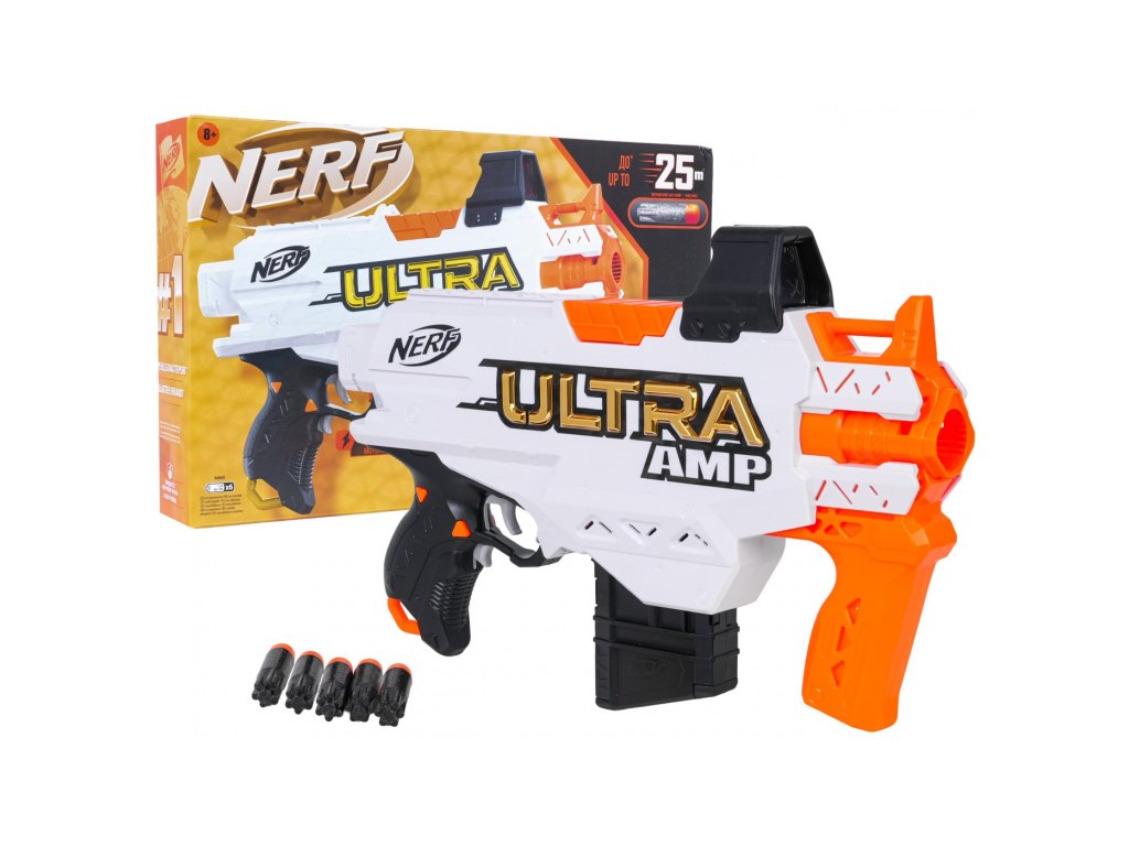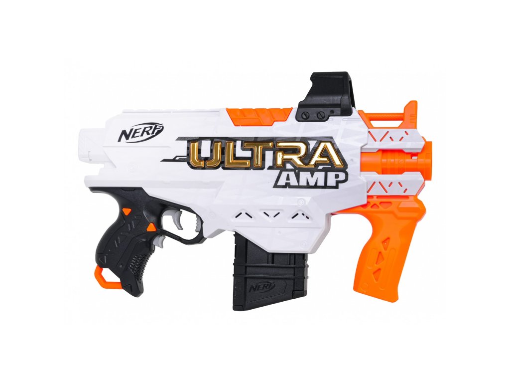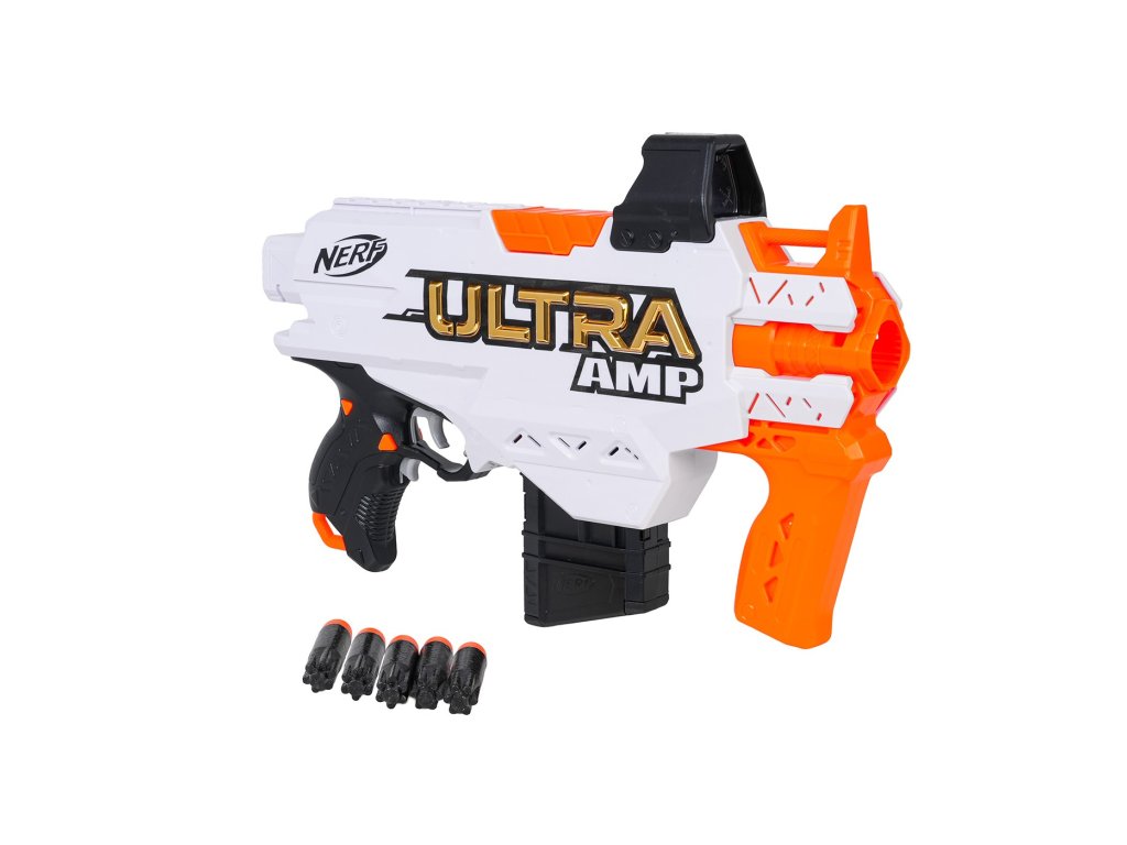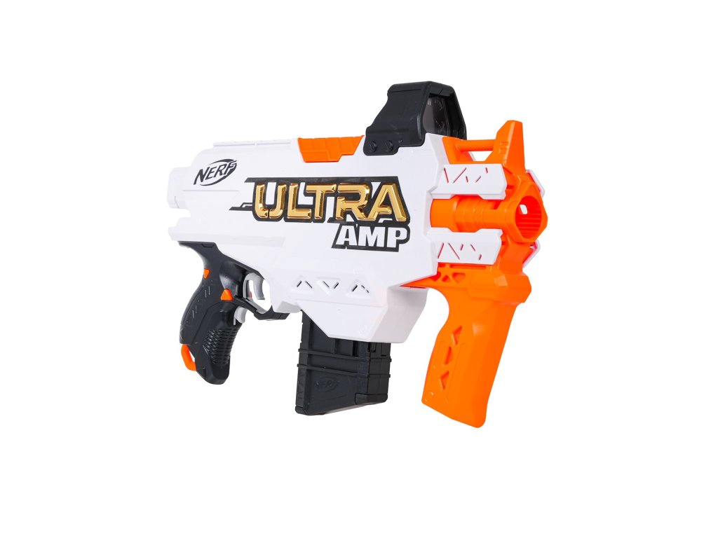 Poloautomatická pistole NERF Ultra AMP s náboji pro děti od 8 let. Pistole je napájena 6 bateriemi typu AA 1,5 V (nejsou součástí balení). Má otevřený prostor na náboje, do kterého se vejde 6 pěnových projektilů. Nabijte buben šipkami, podržte tlačítko pro zrychlení a stiskněte spoušť.