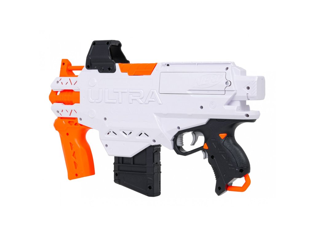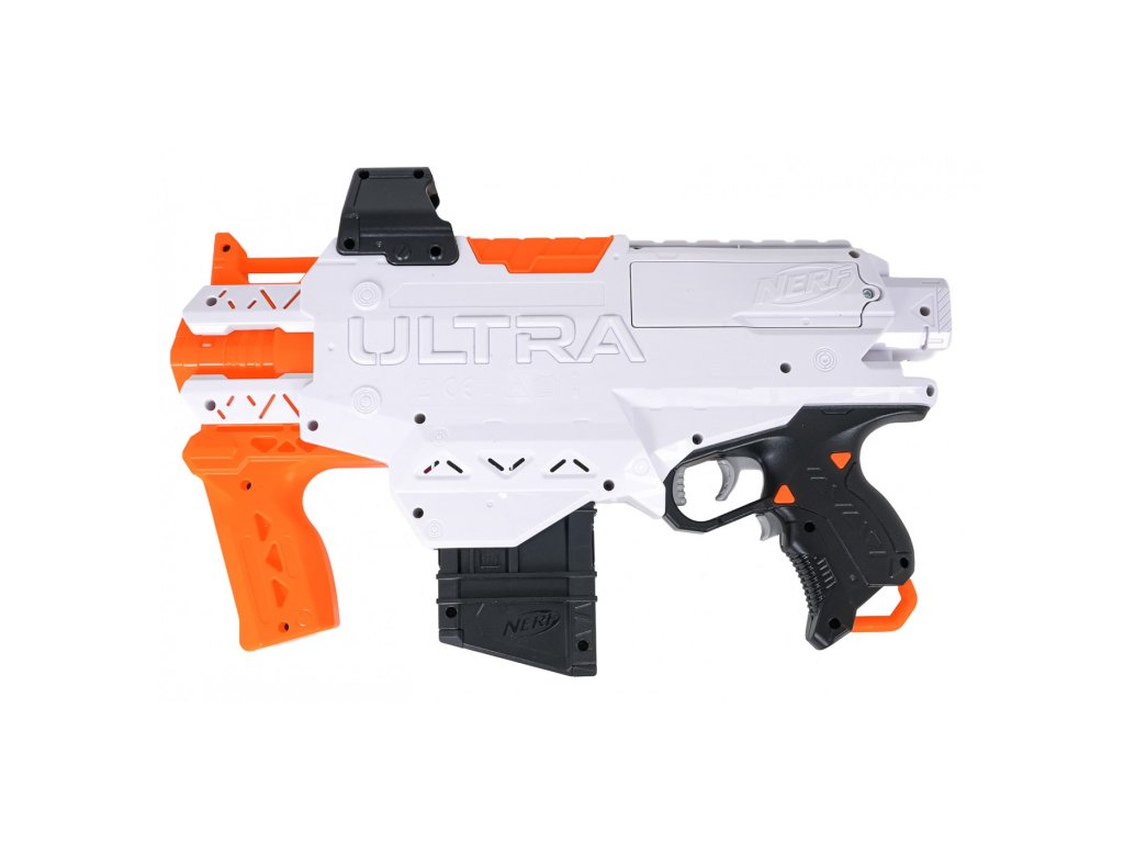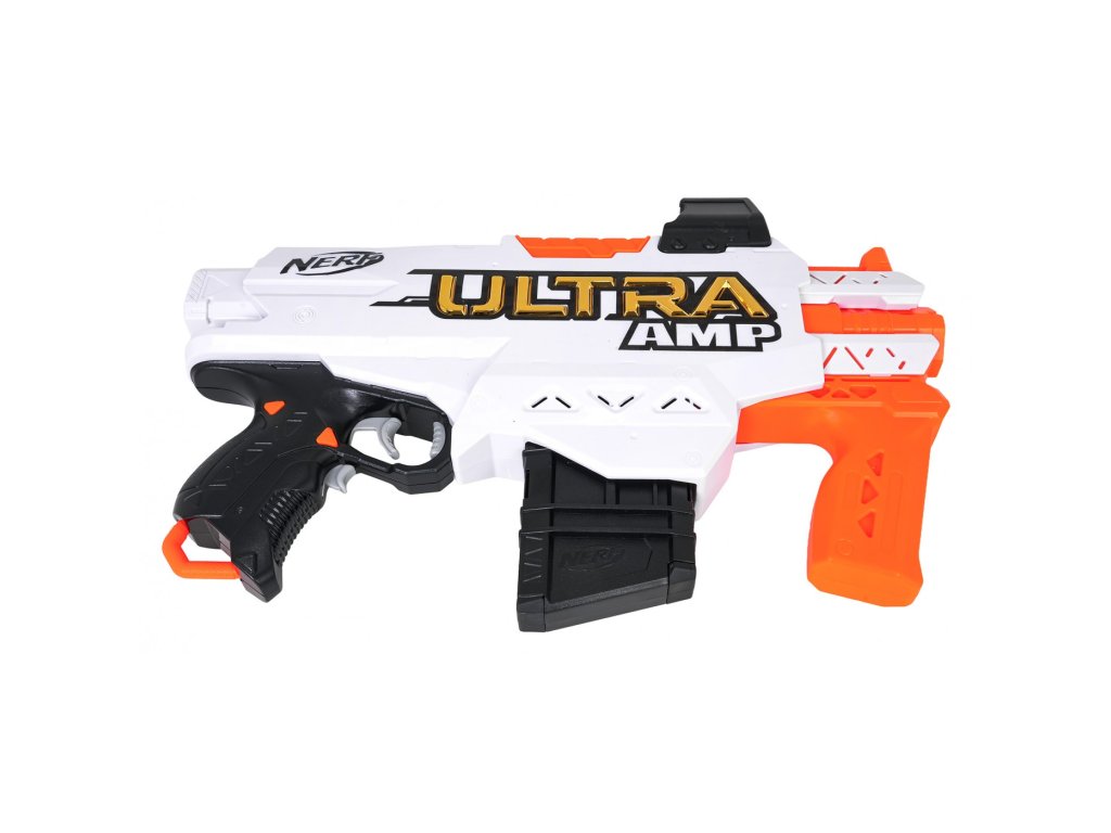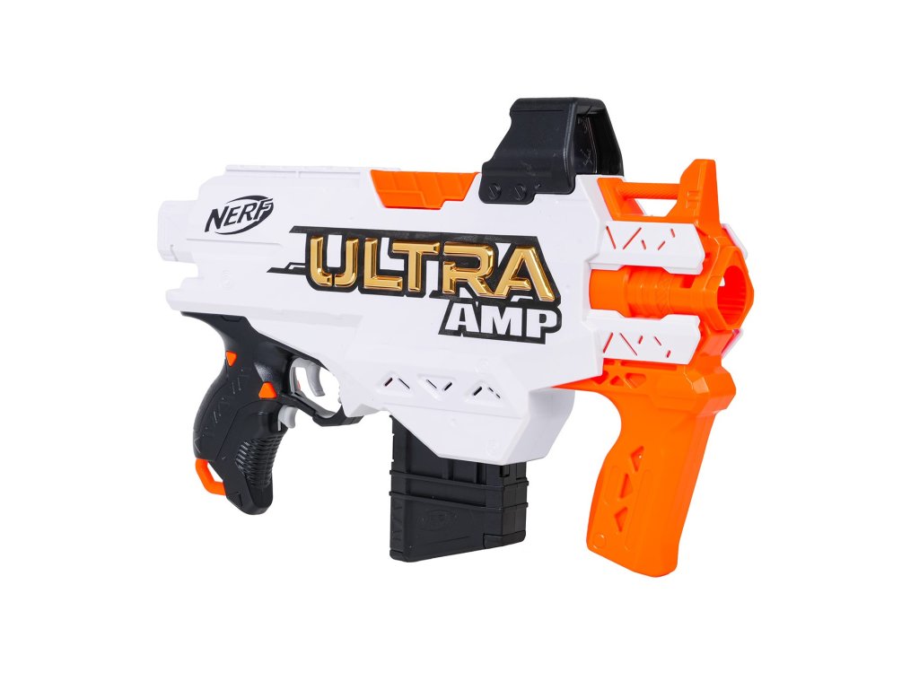 Poloautomatická pistole NERF Ultra AMP s náboji pro děti od 8 let. Pistole je napájena 6 bateriemi typu AA 1,5 V (nejsou součástí balení). Má otevřený prostor na náboje, do kterého se vejde 6 pěnových projektilů. Nabijte buben šipkami, podržte tlačítko pro zrychlení a stiskněte spoušť.