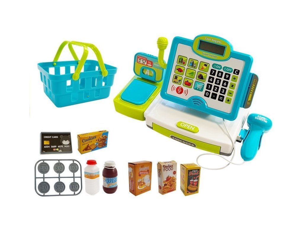 Dětská pokladna s nákupním košíkem a příslušenstvím modrá