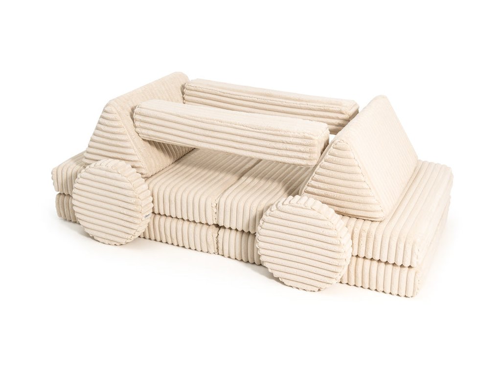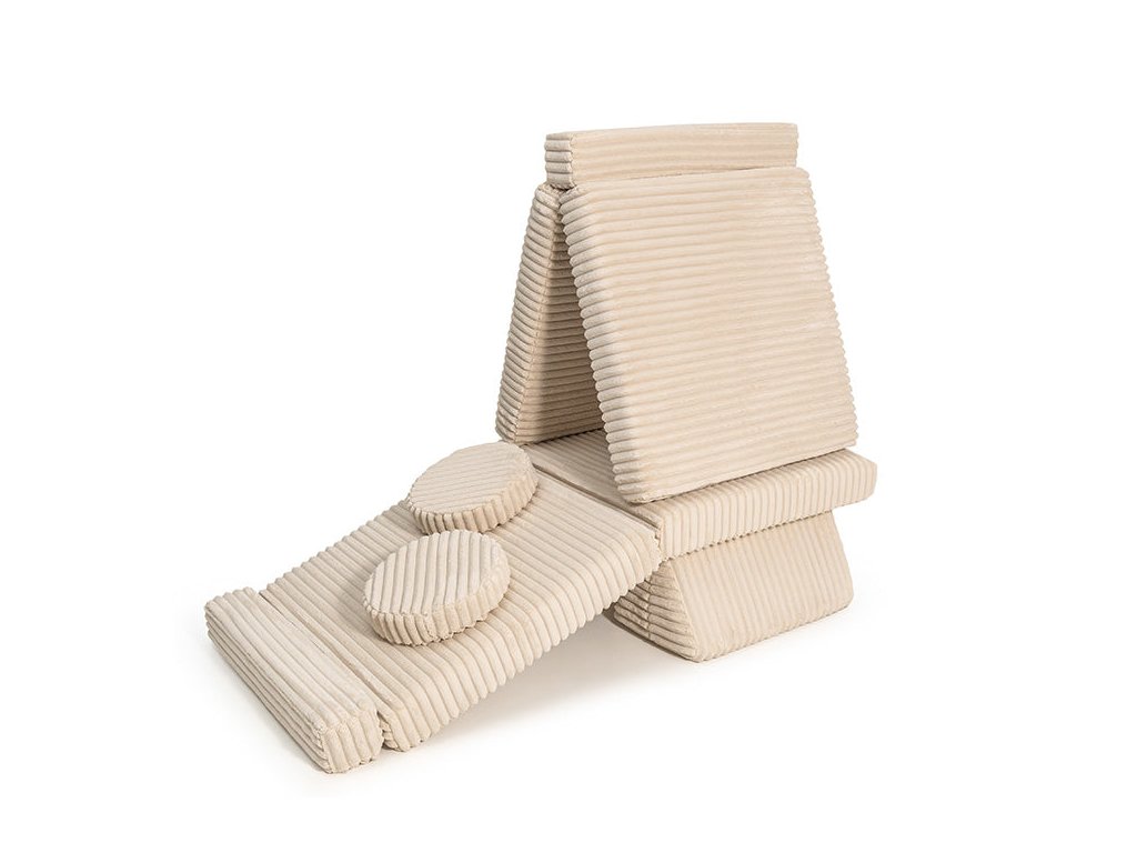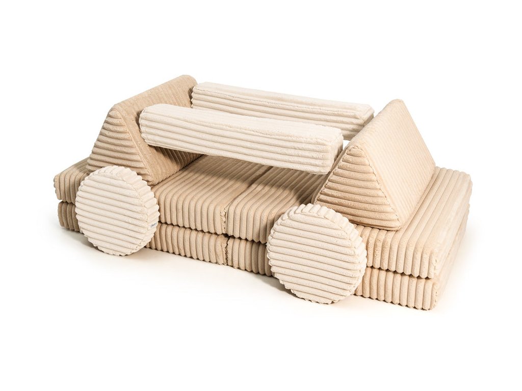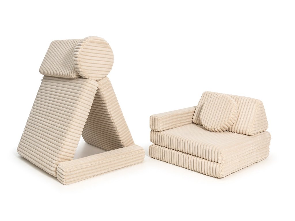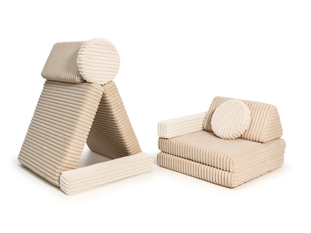 - Hrací pohovka Shappy se skládá z deseti dílů – čtyř sedáků (sešitých po dvou k sobě), dvou trojúhelníků jako opěrek zad, dvou područek a dvou kulatých polštářků – které poskytují pohodlnou a podpůrnou konstrukci pro hraní vašeho dítěte.