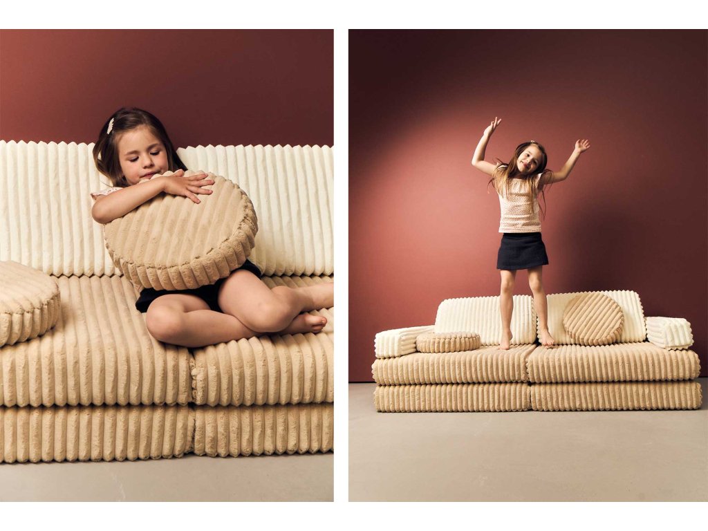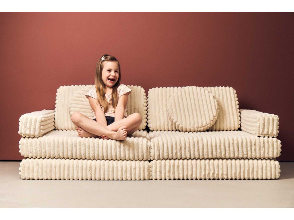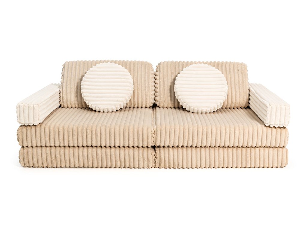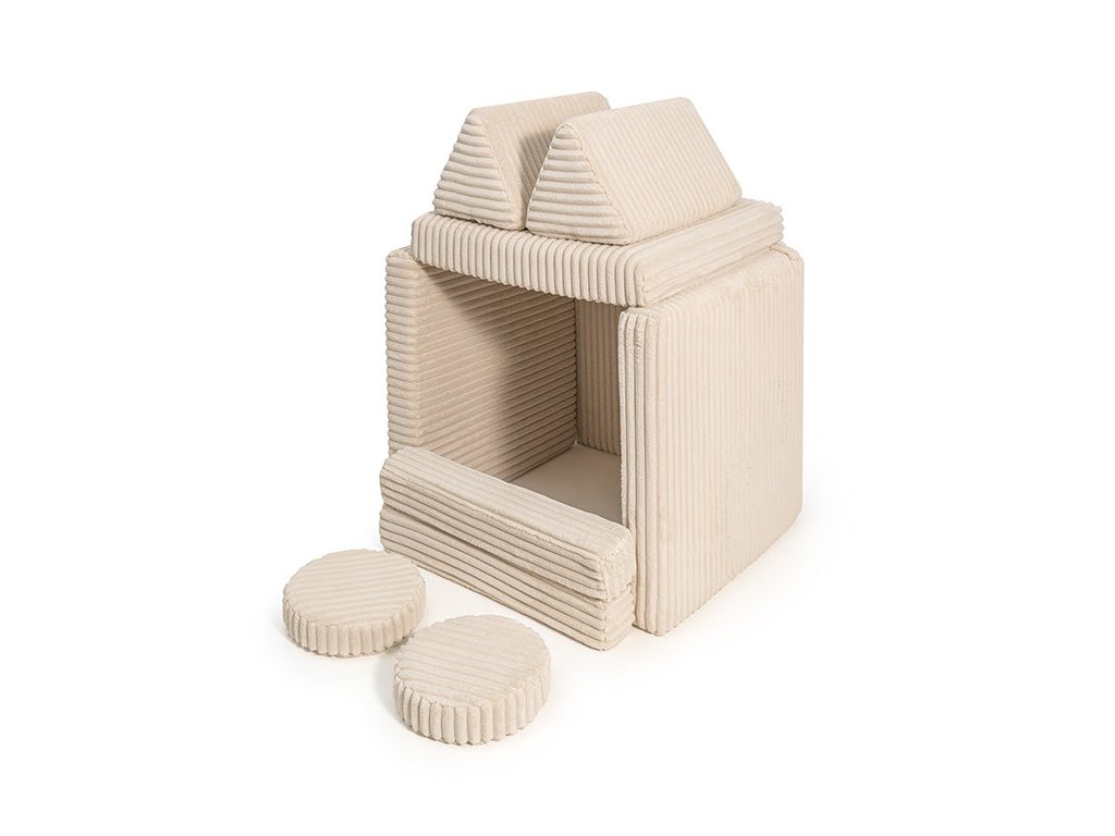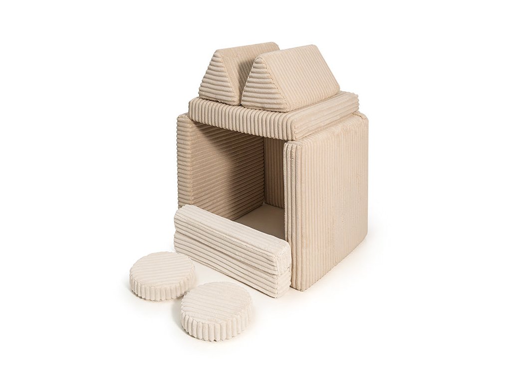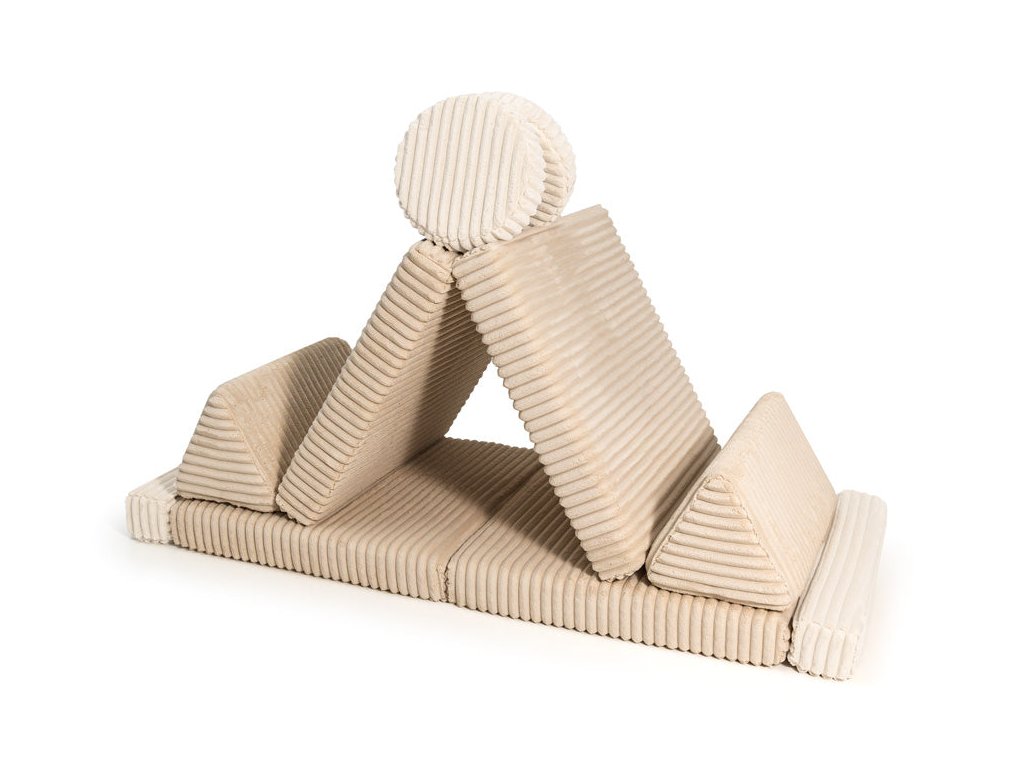 - Hrací pohovka Shappy se skládá z deseti dílů – čtyř sedáků (sešitých po dvou k sobě), dvou trojúhelníků jako opěrek zad, dvou područek a dvou kulatých polštářků – které poskytují pohodlnou a podpůrnou konstrukci pro hraní vašeho dítěte.