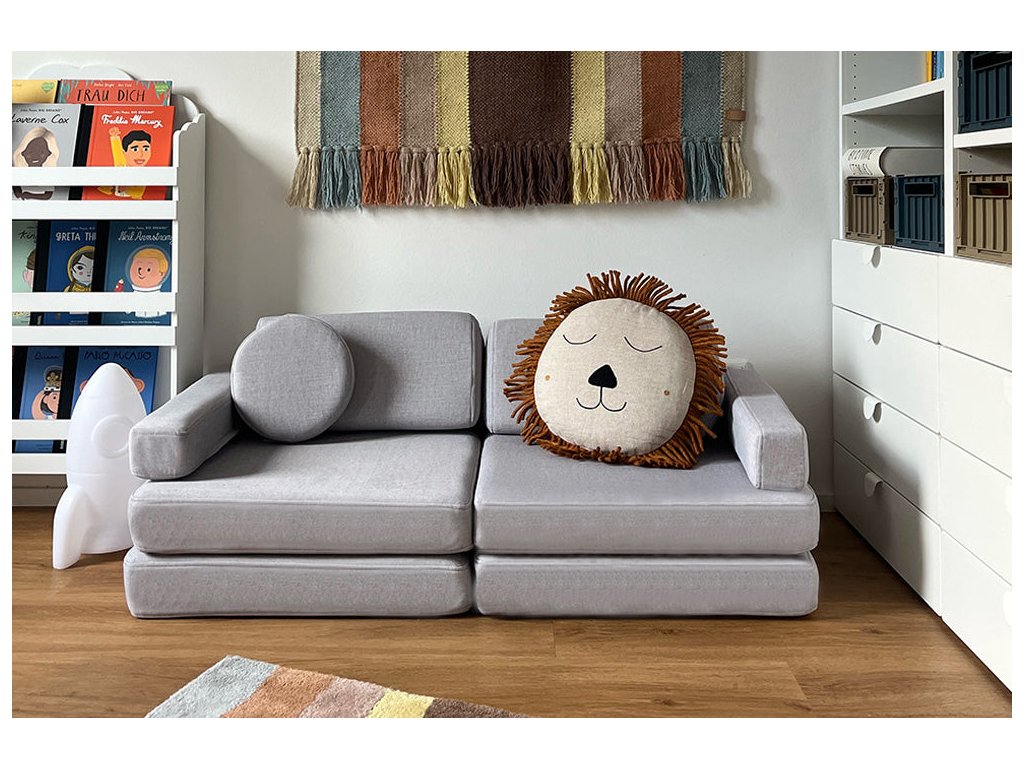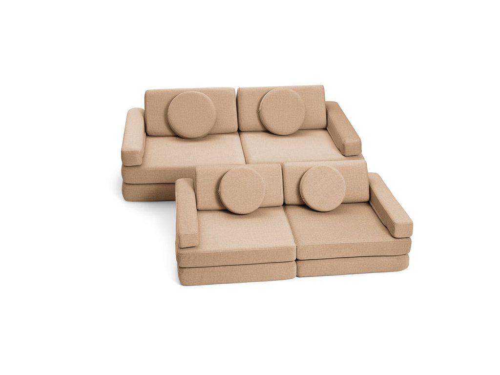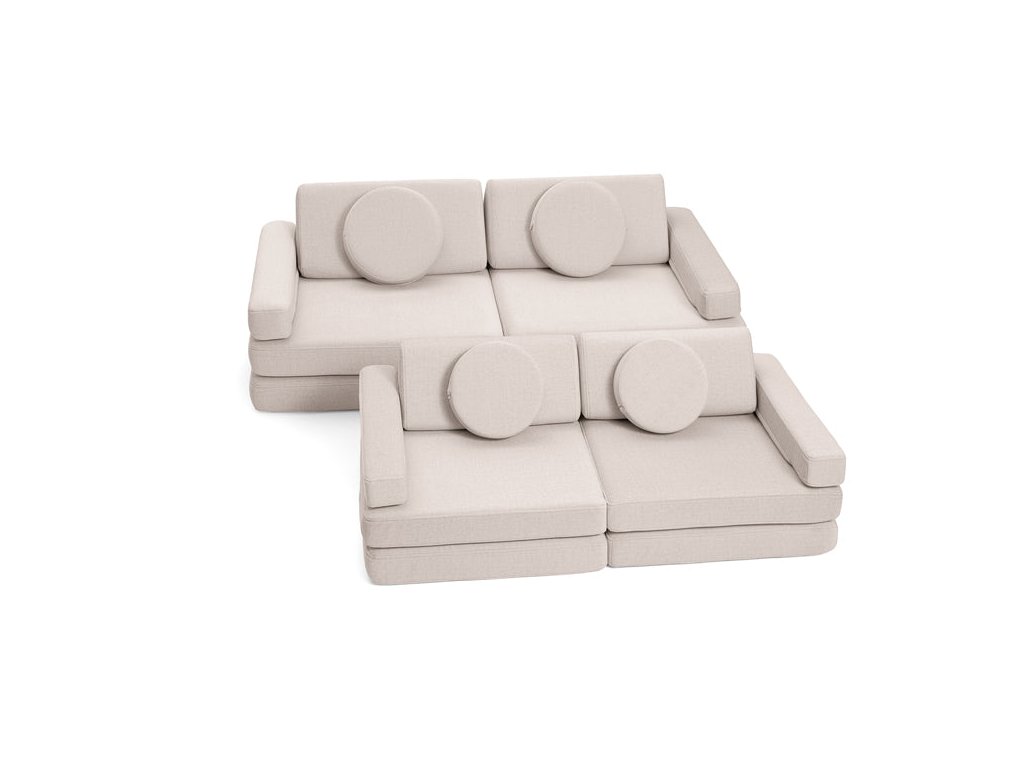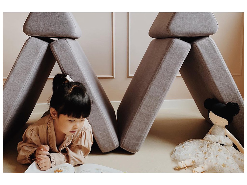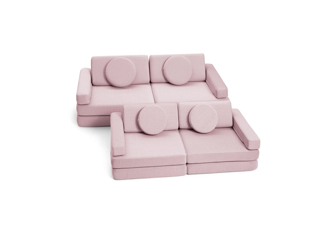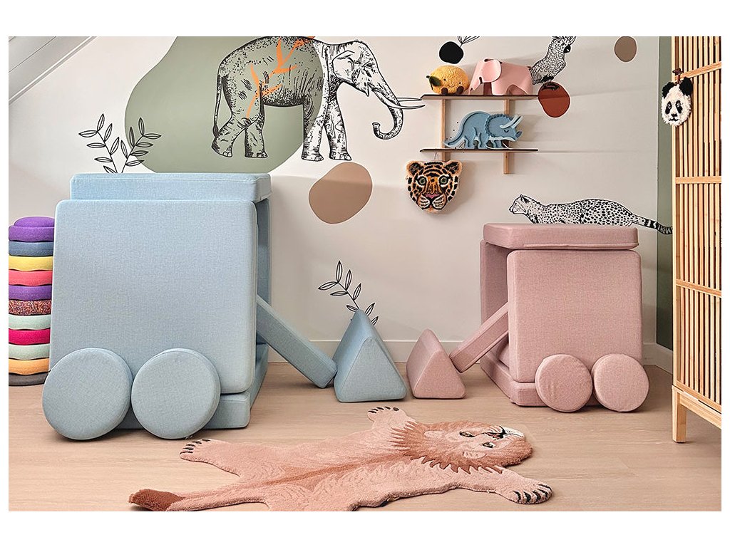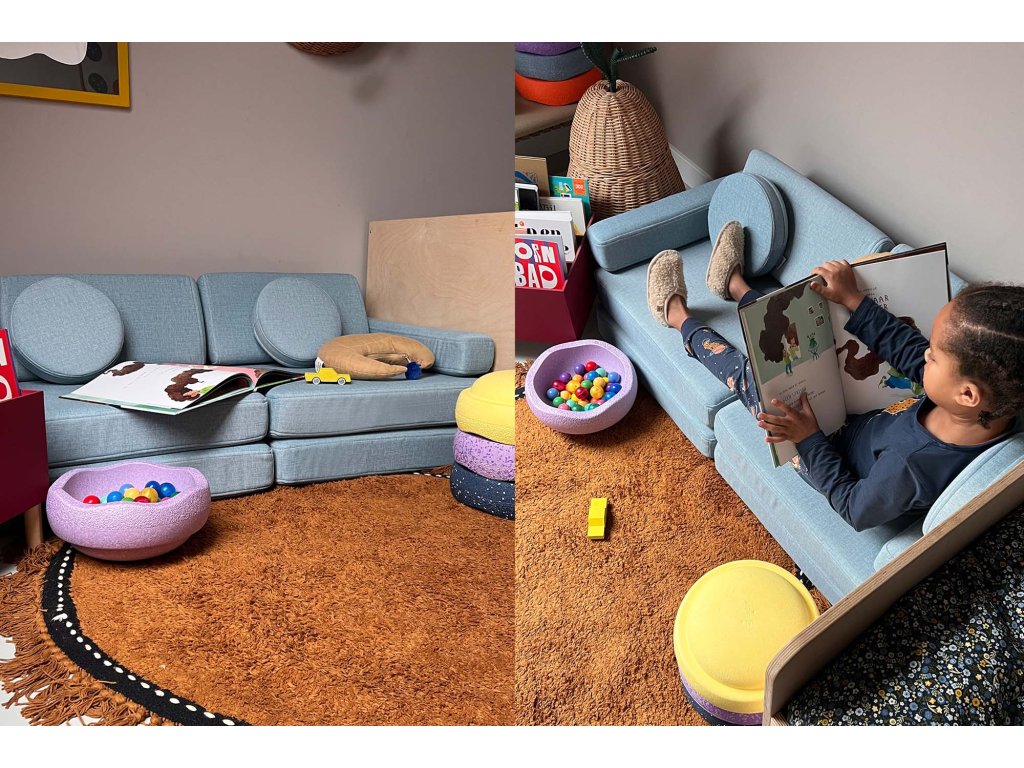 - Hrací pohovka Shappy Mini se skládá z osmi dílů – čtyř sedáků (sešitých po dvou k sobě), dvou trojúhelníků jako opěrek zad, dvou područek a dvou kulatých polštářků – které poskytují pohodlnou a podpůrnou konstrukci pro hraní vašeho dítěte.