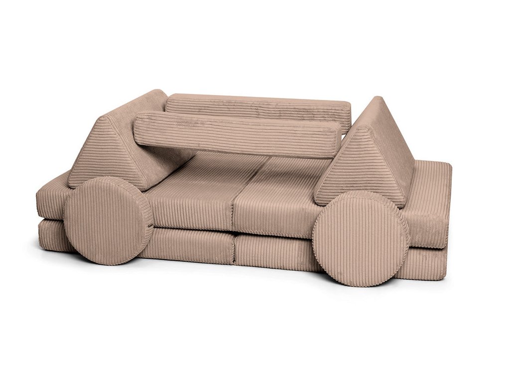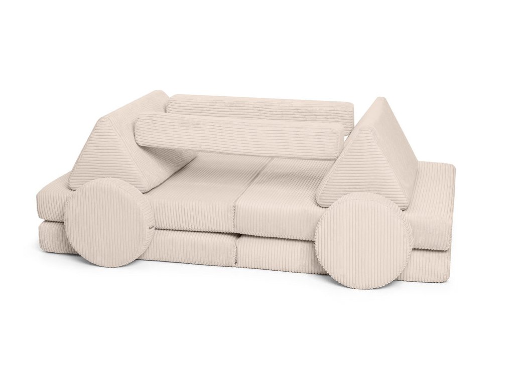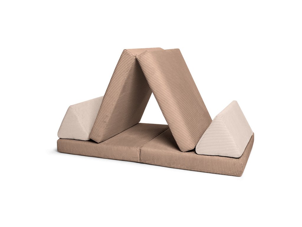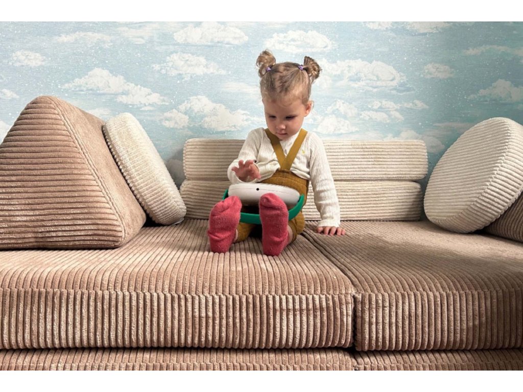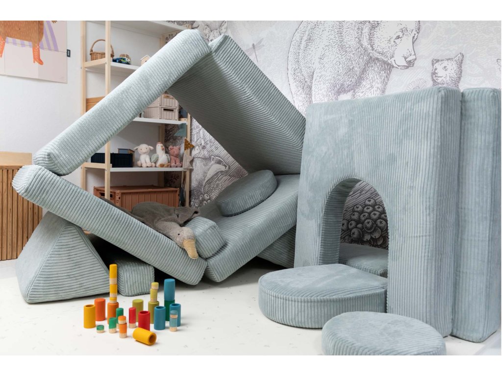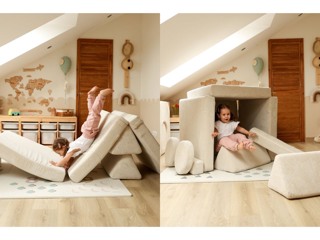 Hrací pohovka Shappy je modulární 10dílná sestava, která se z pohodlné pohovky promění v bunkry, skluzavky a útulné čtecí koutky – nebo dokonce v lůžko na přespání. Je navržena pro každodenní hraní i odpočinek, s pratelnými potahy a bezpečnými, odolnými materiály.