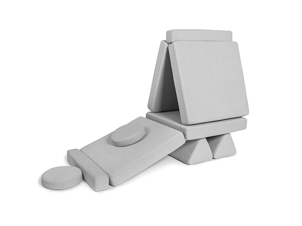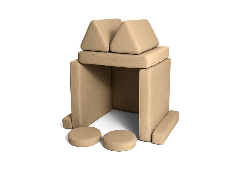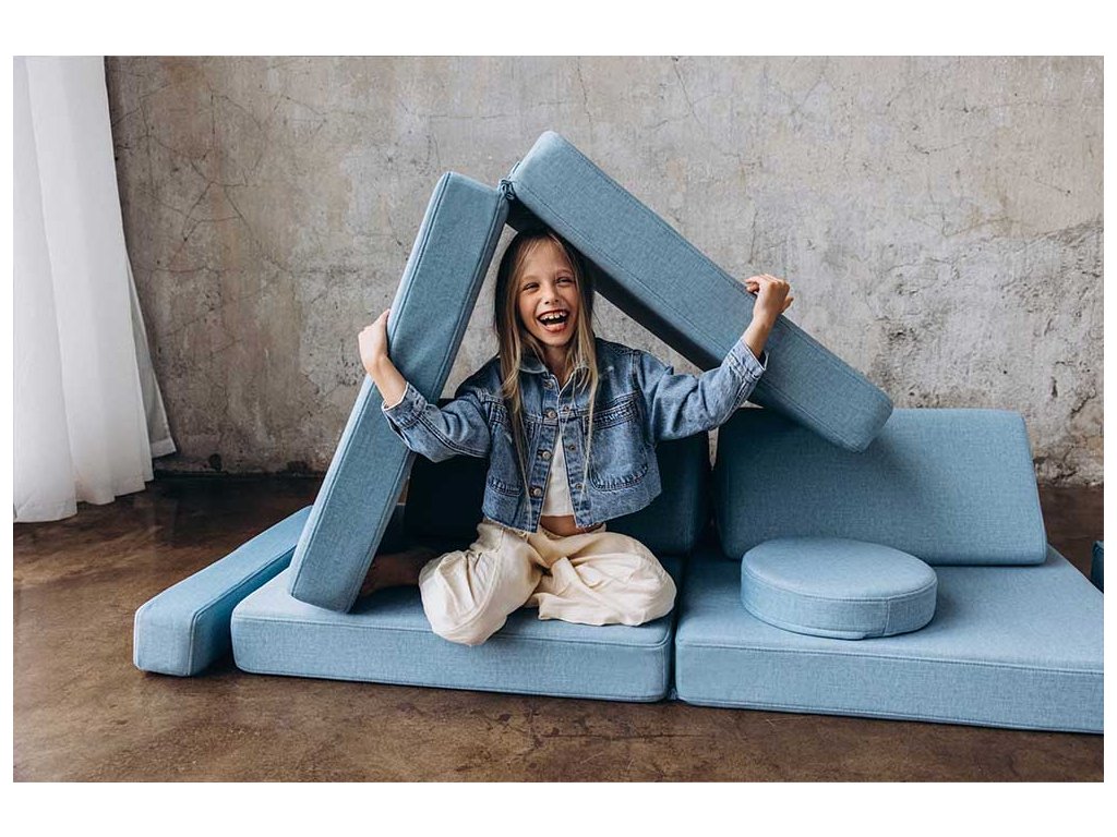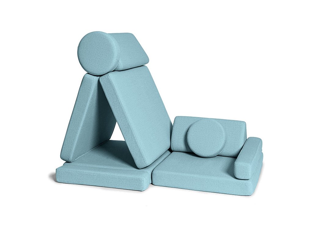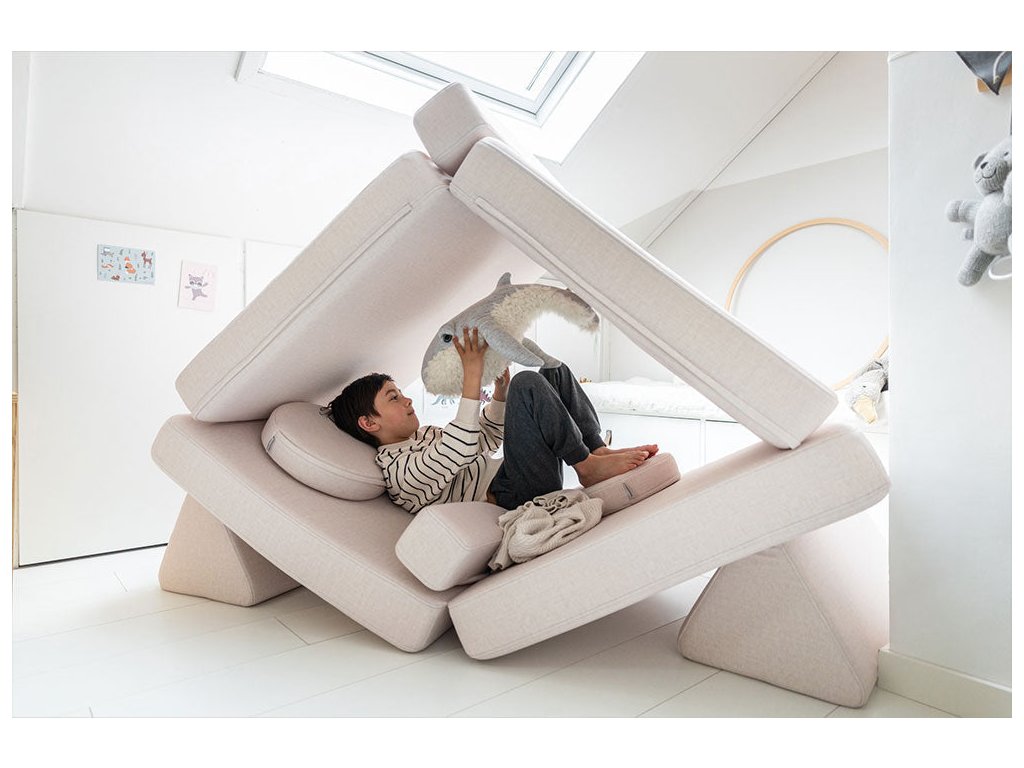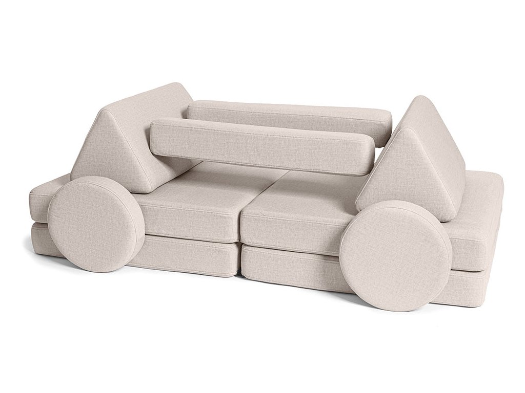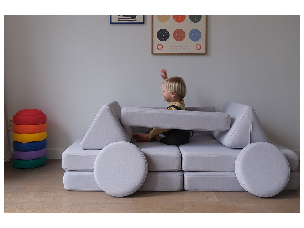 - Hrací pohovka Shappy se skládá z osmi dílů – čtyř sedáků (sešitých po dvou k sobě), dvou trojúhelníků jako opěrek zad, dvou područek a dvou kulatých polštářků – které poskytují pohodlnou a podpůrnou konstrukci pro hraní vašeho dítěte.