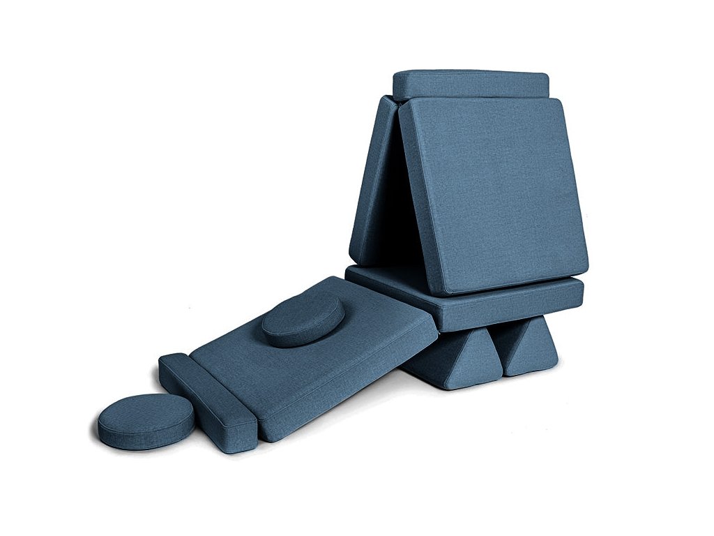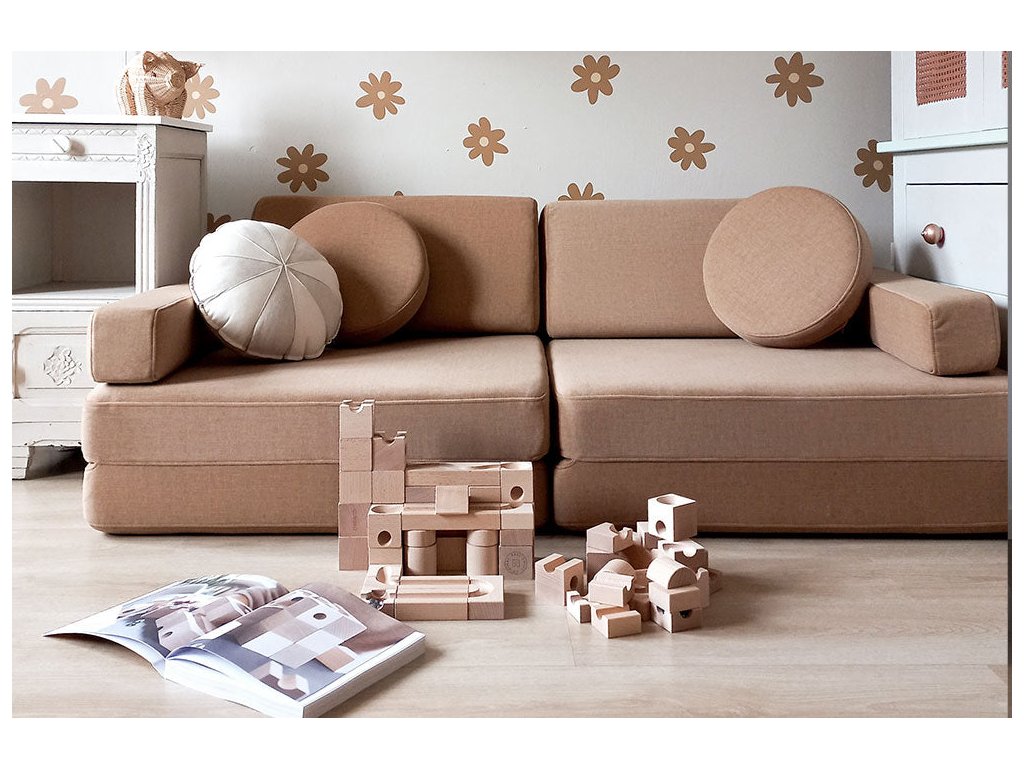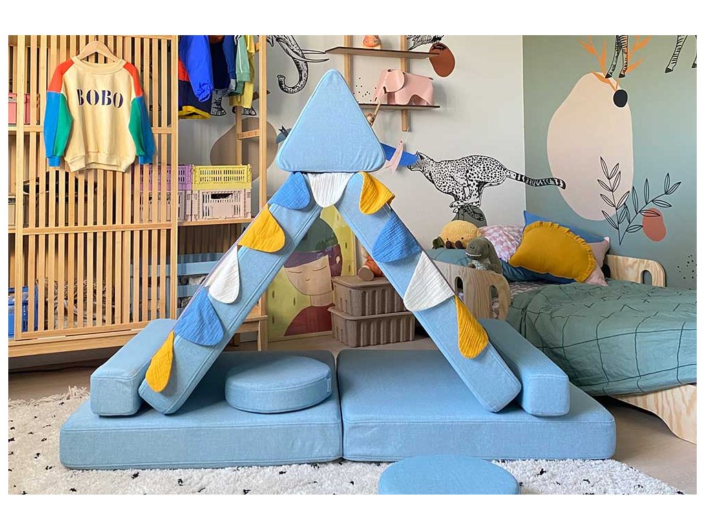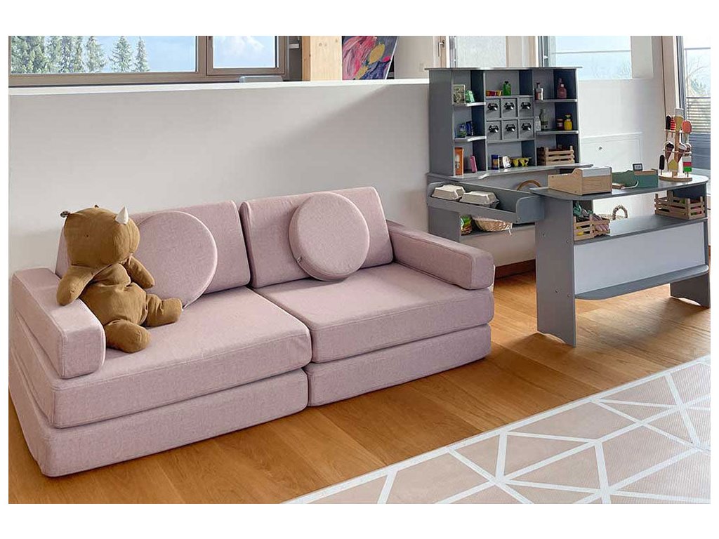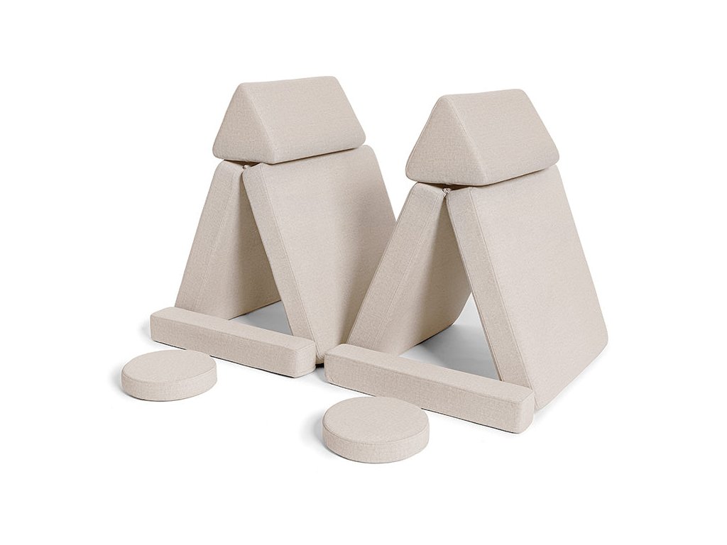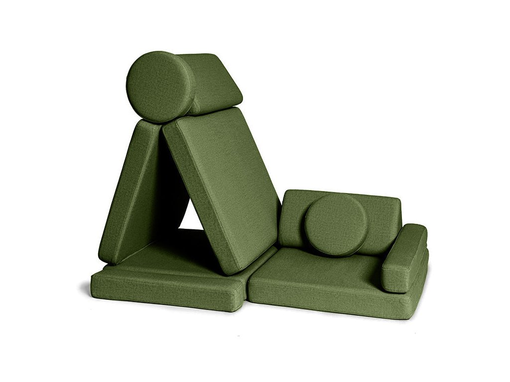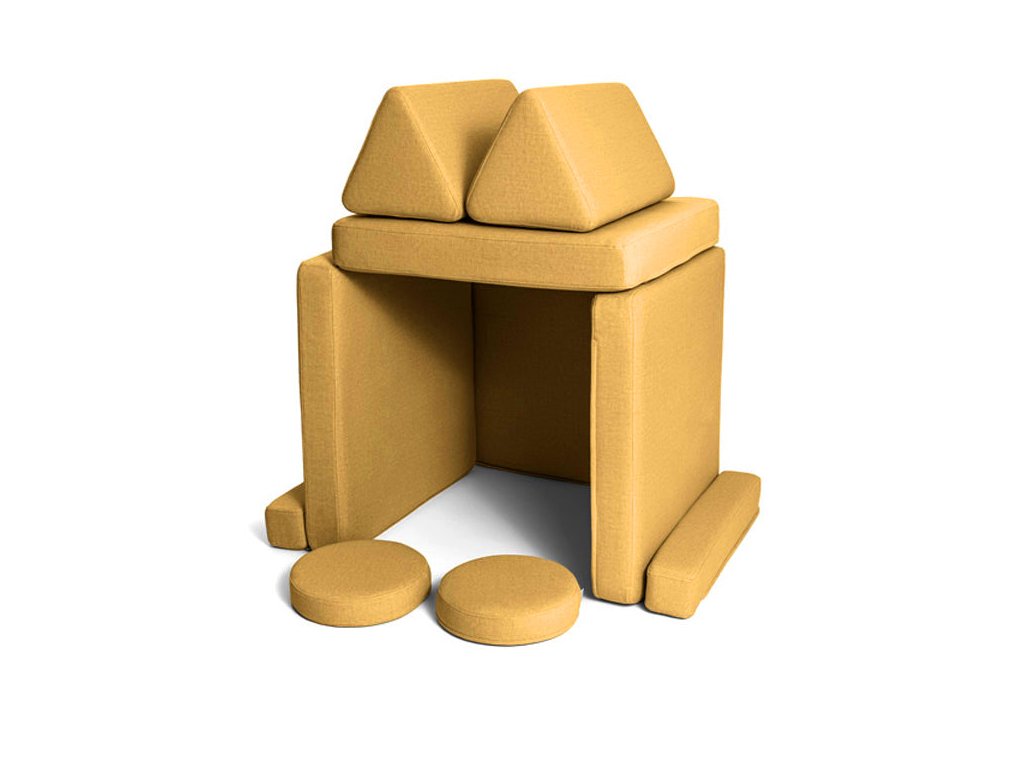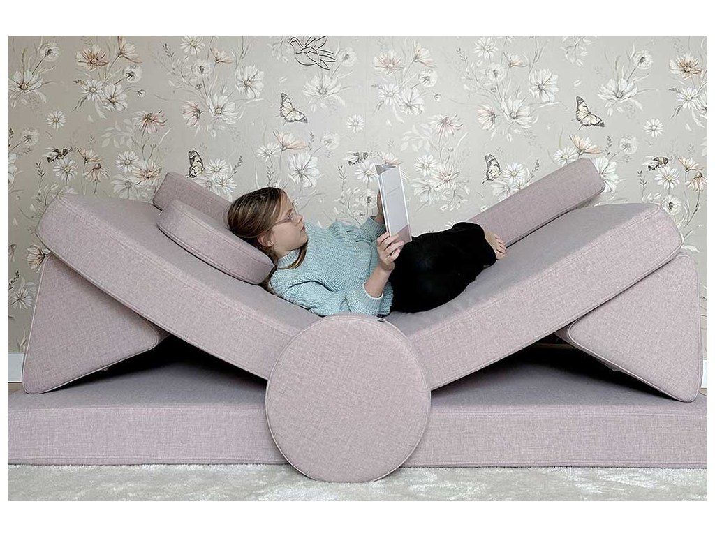 - Hrací pohovka Shappy se skládá z osmi dílů – čtyř sedáků (sešitých po dvou k sobě), dvou trojúhelníků jako opěrek zad, dvou područek a dvou kulatých polštářků – které poskytují pohodlnou a podpůrnou konstrukci pro hraní vašeho dítěte.