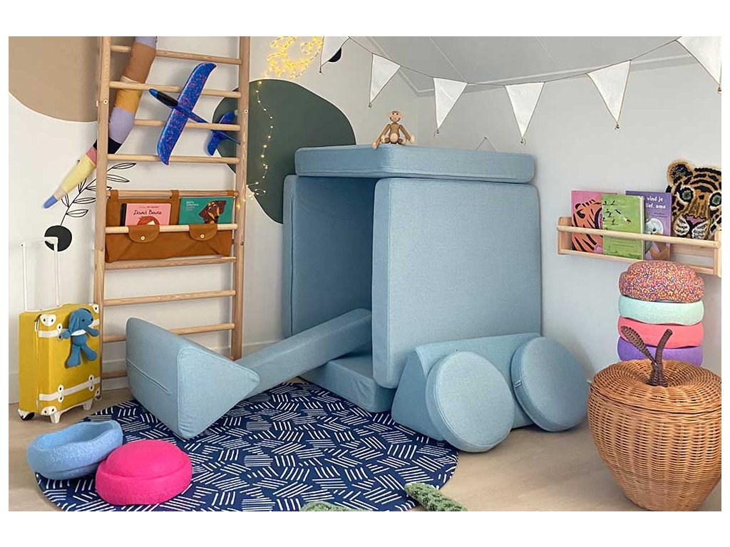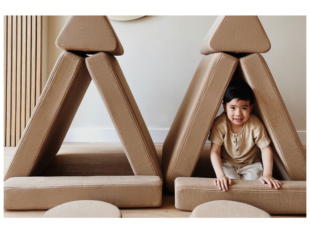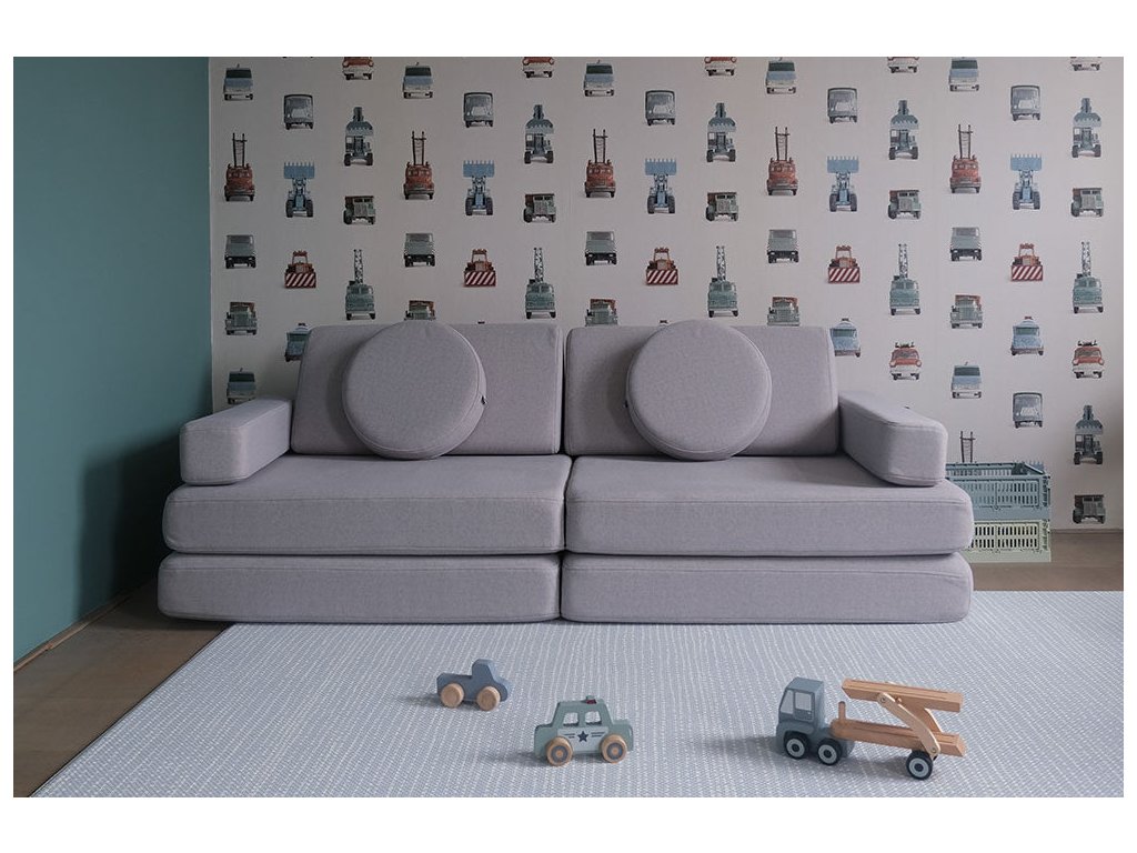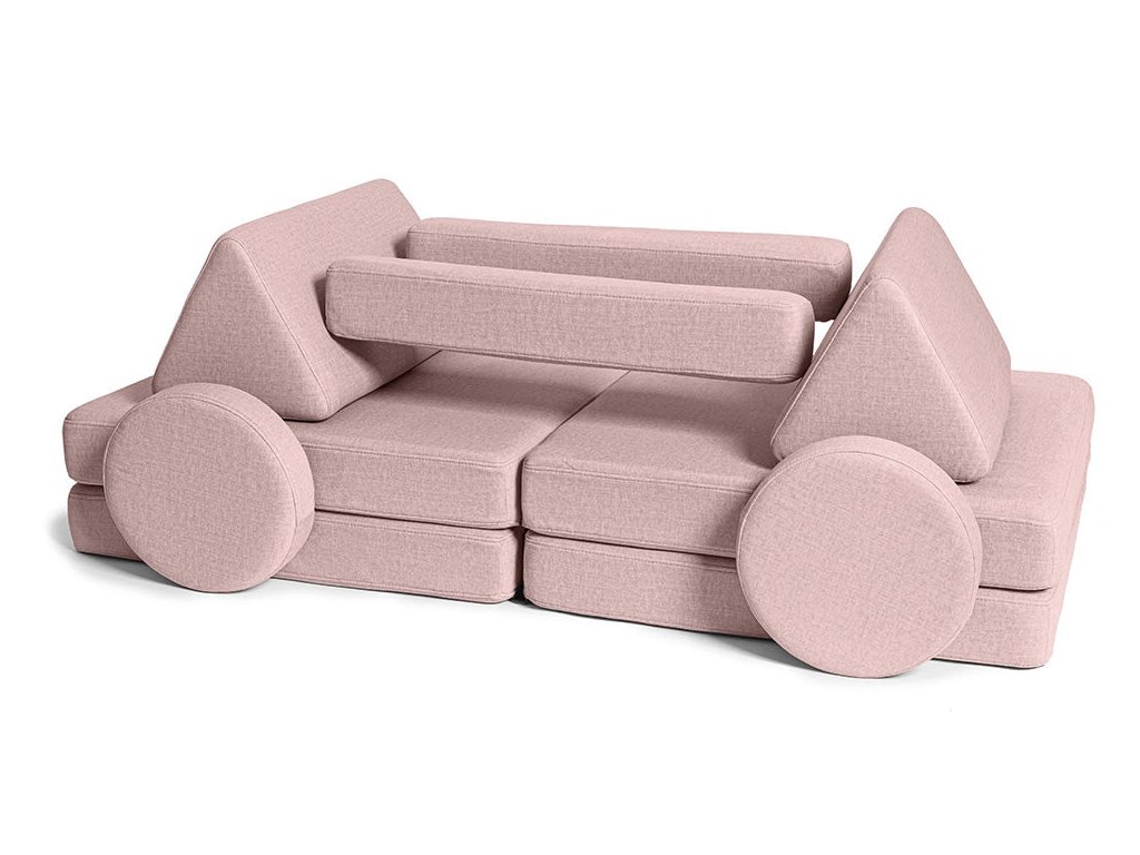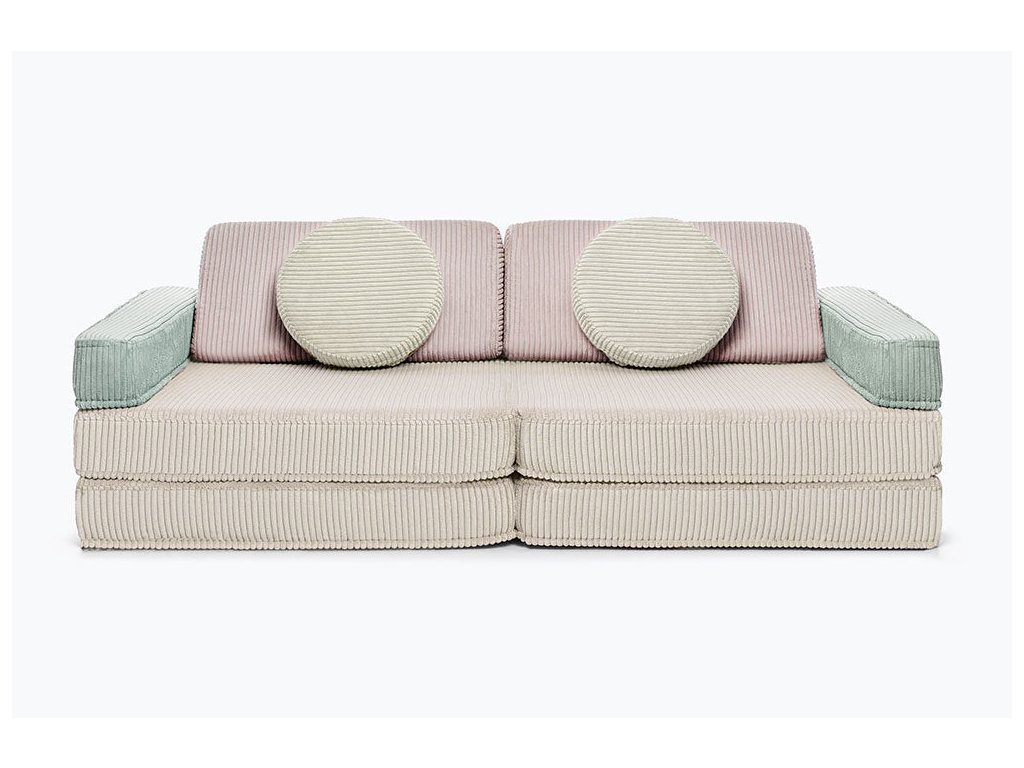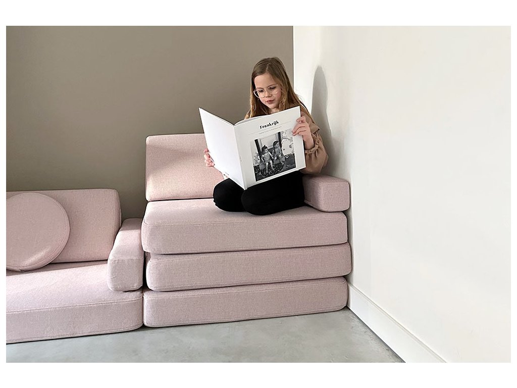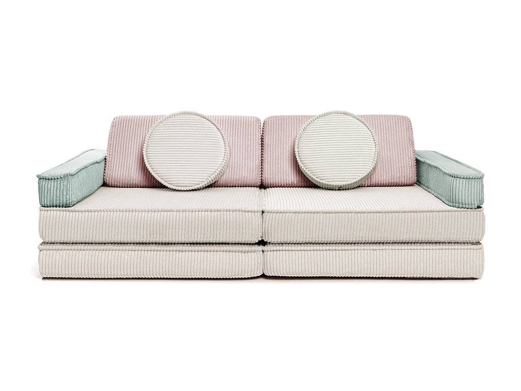 - Hrací pohovka Shappy se skládá z osmi dílů – čtyř sedáků (sešitých po dvou k sobě), dvou trojúhelníků jako opěrek zad, dvou područek a dvou kulatých polštářků – které poskytují pohodlnou a podpůrnou konstrukci pro hraní vašeho dítěte.