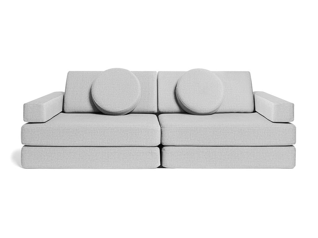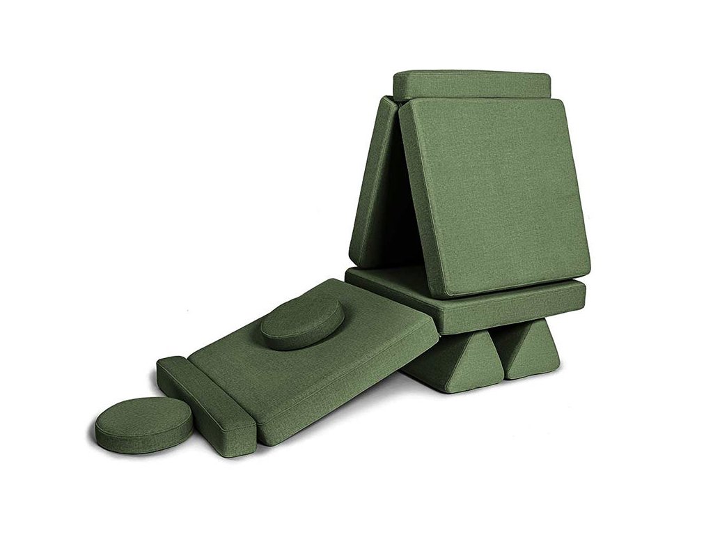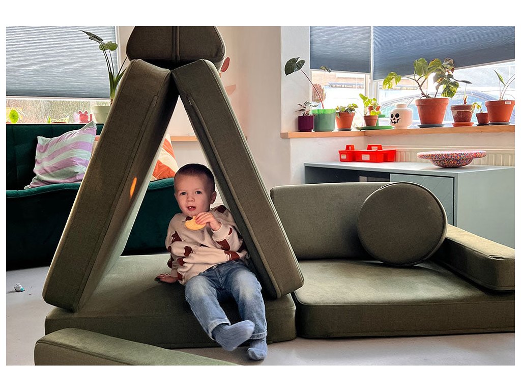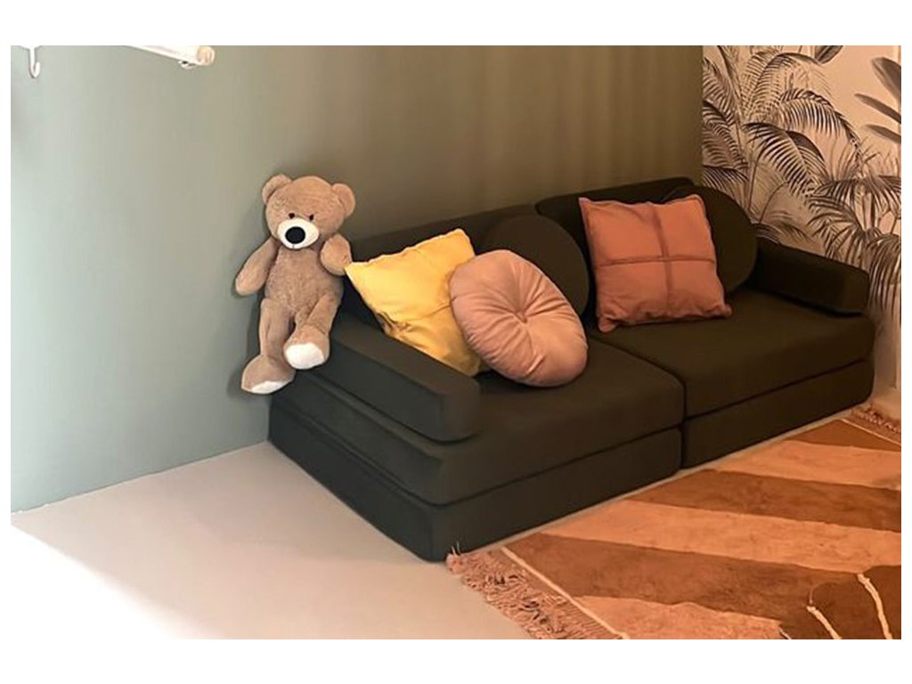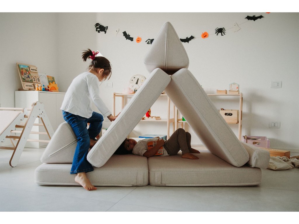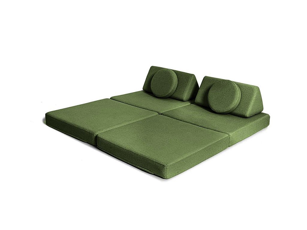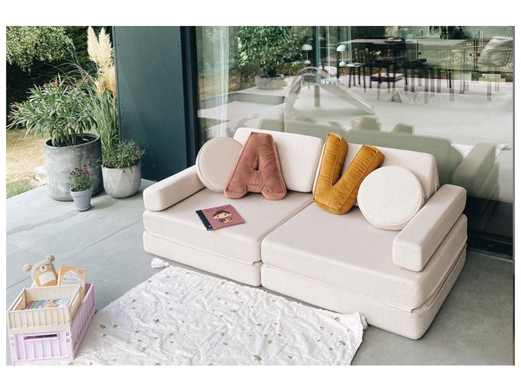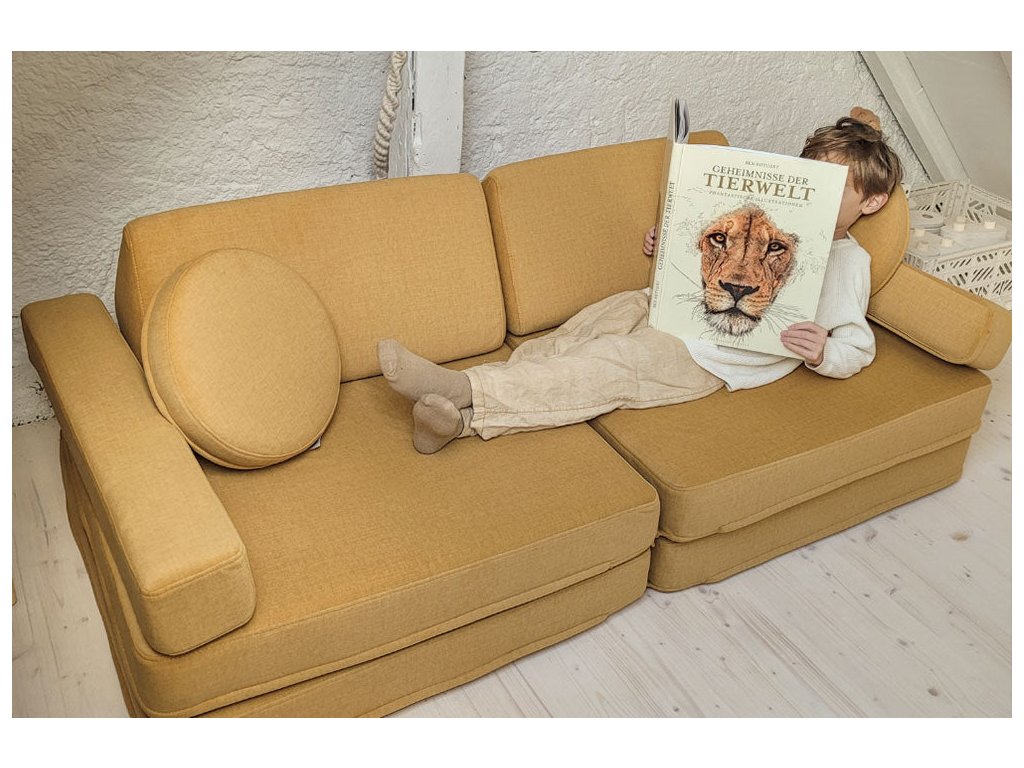 - Hrací pohovka Shappy se skládá z osmi dílů – čtyř sedáků (sešitých po dvou k sobě), dvou trojúhelníků jako opěrek zad, dvou područek a dvou kulatých polštářků – které poskytují pohodlnou a podpůrnou konstrukci pro hraní vašeho dítěte.