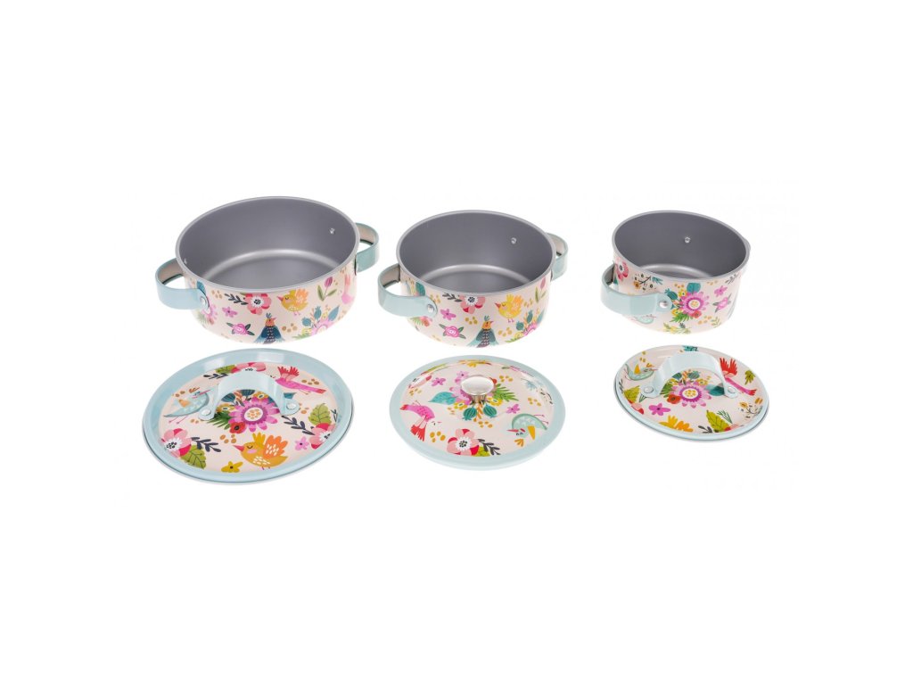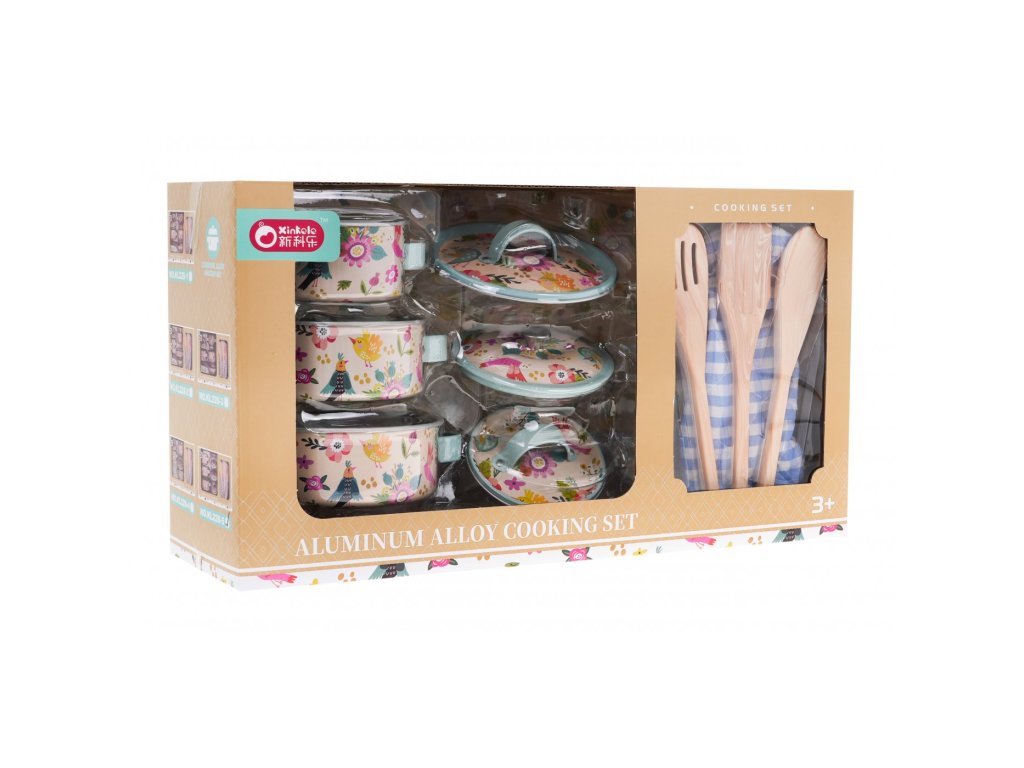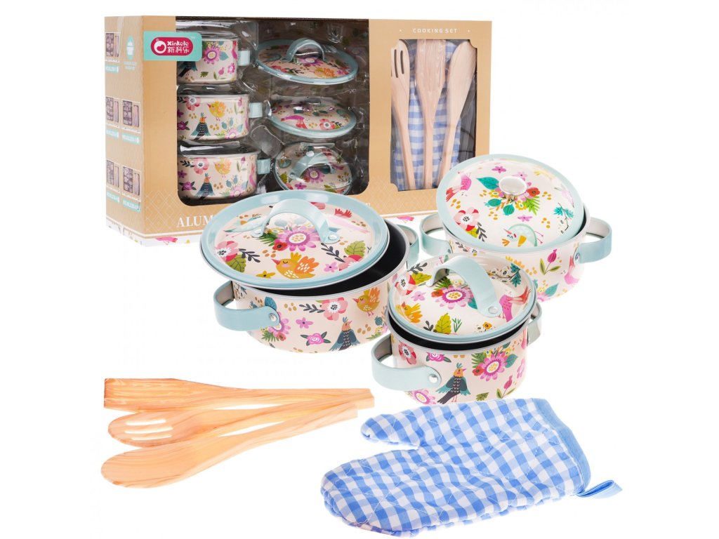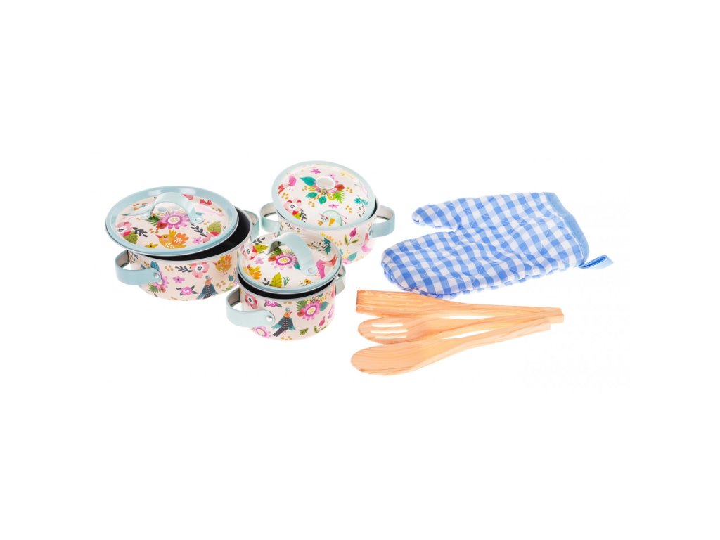 Kvalitně vyrobená sada hliníkových hrnců a kuchyňských doplňků je vhodná pro děti od 3 let. Sada se skládá z 10 položek, jako jsou hrnce s pokličkami, kuchyňské náčiní a kuchyňská rukavice.