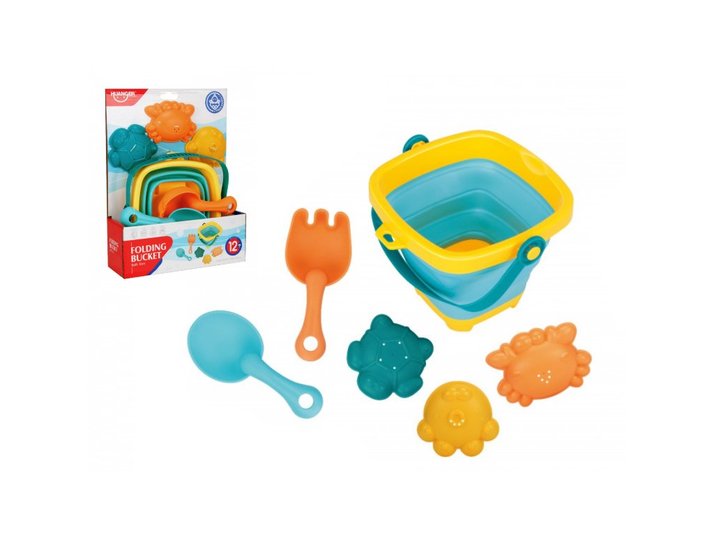 Dětská sada na písek se skládá z kbelíku, lopatky, hrábek a třech formiček. Naše sada nezabírá mnoho místa a snadno se přenáší, protože je vyrobena z měkkého, pružného plastu a kbelík lze složit.