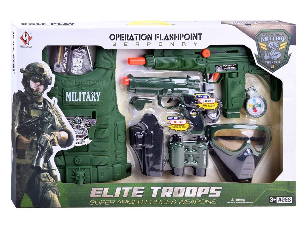 Sada pro malé vojáky určitě zaujme ty nejmenší. V sadě je vše potřebné pro správného vojáka, který bojuje se zločinem. Sada zaručuje dlouhé hodiny zábavy s kamarády a také fantazií.