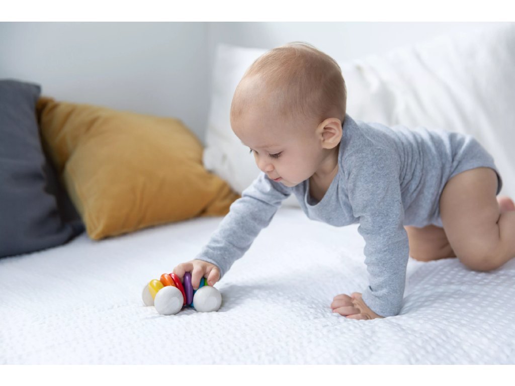 Barevné autíčko má flexibilní tělo, které reaguje na dotek dítěte a podporuje rozvoj vizuálních a pohybových dovedností.