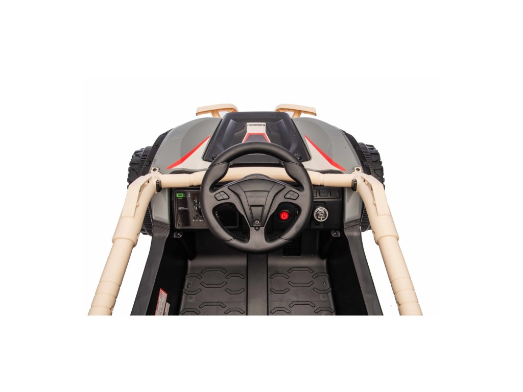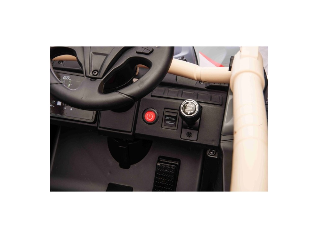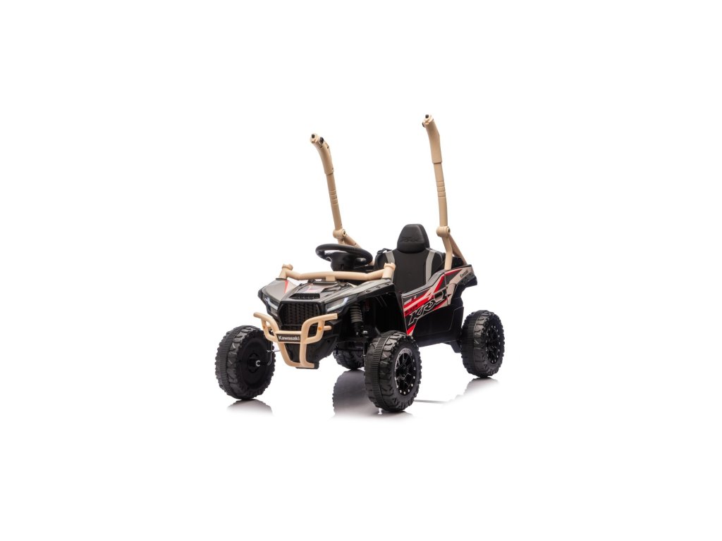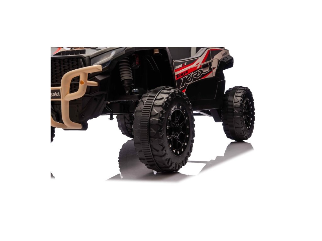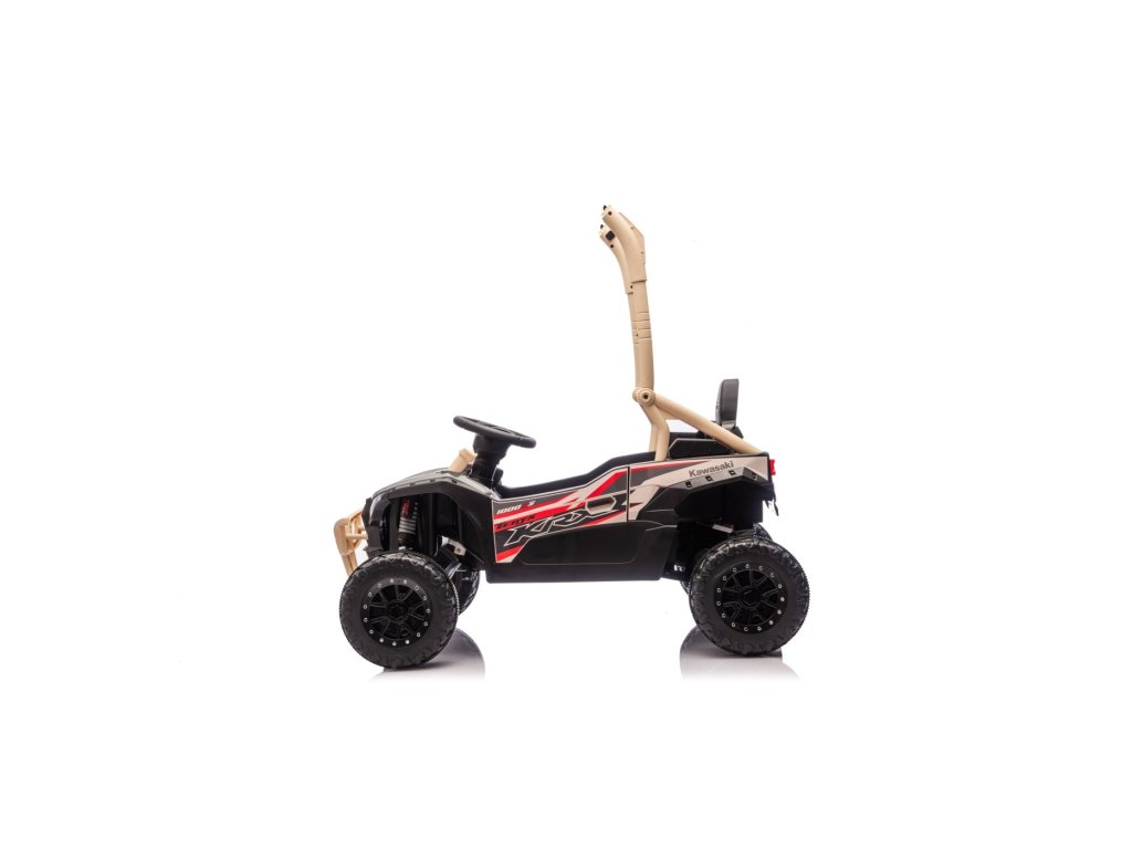 Stylové dětské vozítko Buggy Kawasaki TERYX KRX1000 je ideální volbou pro malé řidiče, kteří milují jízdu v terénu i na hladkém povrchu. Výkonný 24V systém se čtyřmi motory (2× 20W vpředu, 2× 45W vzadu) zajistí dostatek síly i pro nerovný terén. Vozítko je vybaveno měkkými EVA koly, pohodlným koženým sedadlem a bezpečnostními pásy. Díky dálkovému ovládání s funkcí STOP mají rodiče vozítko vždy pod kontrolou. Výbava zahrnuje LED světla, audio panel s Bluetooth, MP3, USB vstupem a dalšími funkcemi.