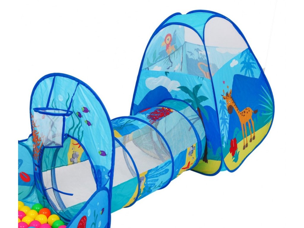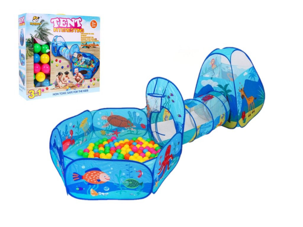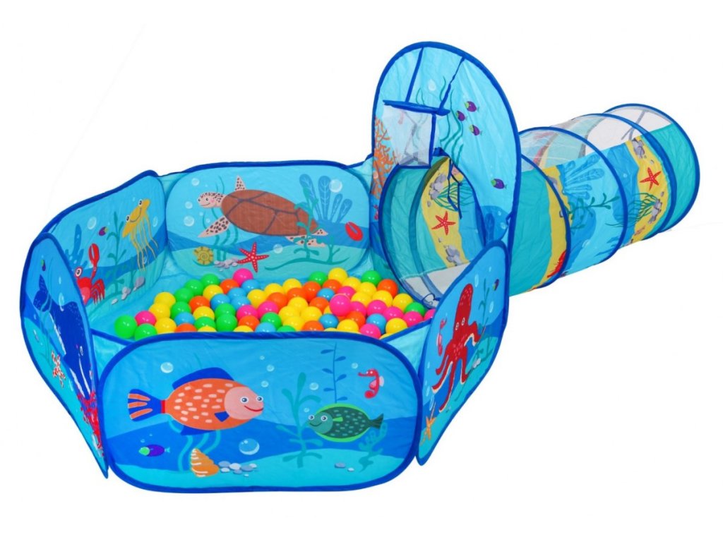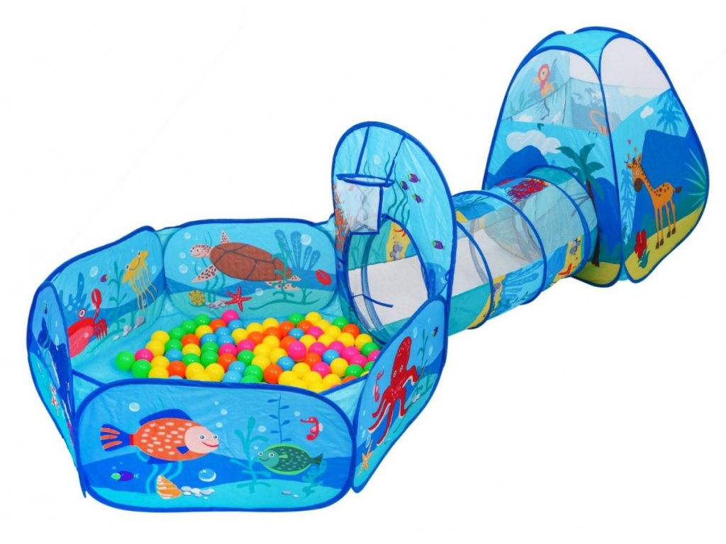 Dětské hřiště 3 v 1 v podobě suchého bazénku s míčky, mini košem, tunelem a stanem. Každý z těchto prvků může být samostatným herním předmětem. Dětské hřiště je rozložené a složené v mrknutí oka a po složení zabírá málo místa. Dětské hřiště je vhodné pro hraní v dětském pokoji i venku na zahradě.