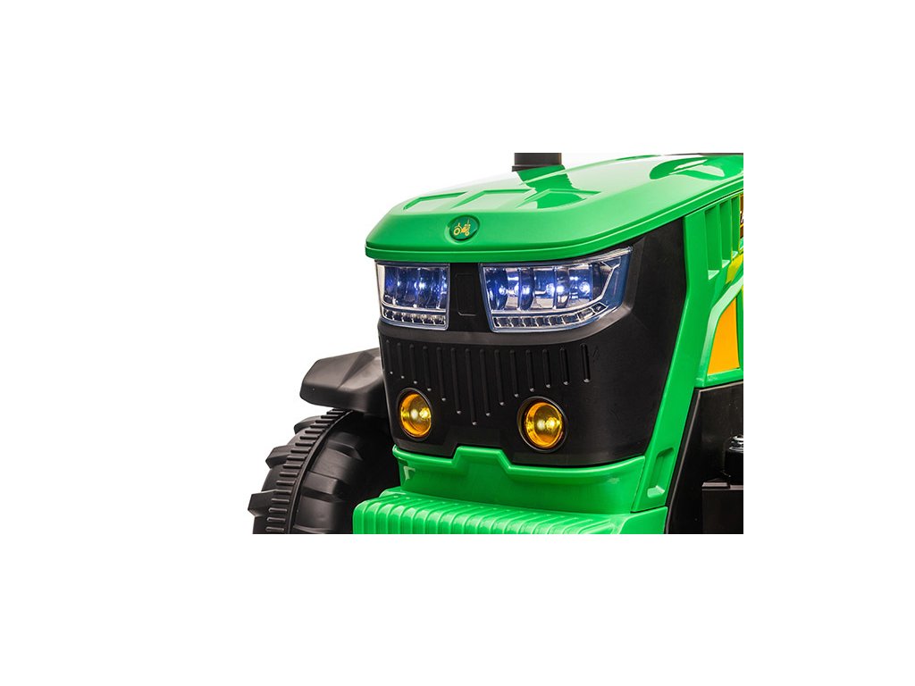 Pohodlné sedadlo s bezpečnostními pásy zajišťuje bezpečí dítěte během jízdy. Hudební panel s USB, AUX vstupem a slotem pro paměťovou kartu nabízí zábavu a interaktivitu. Přední světla přispívají k realističtějšímu vzhledu traktoru.