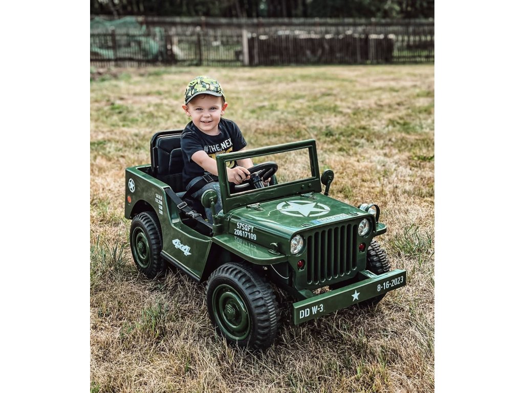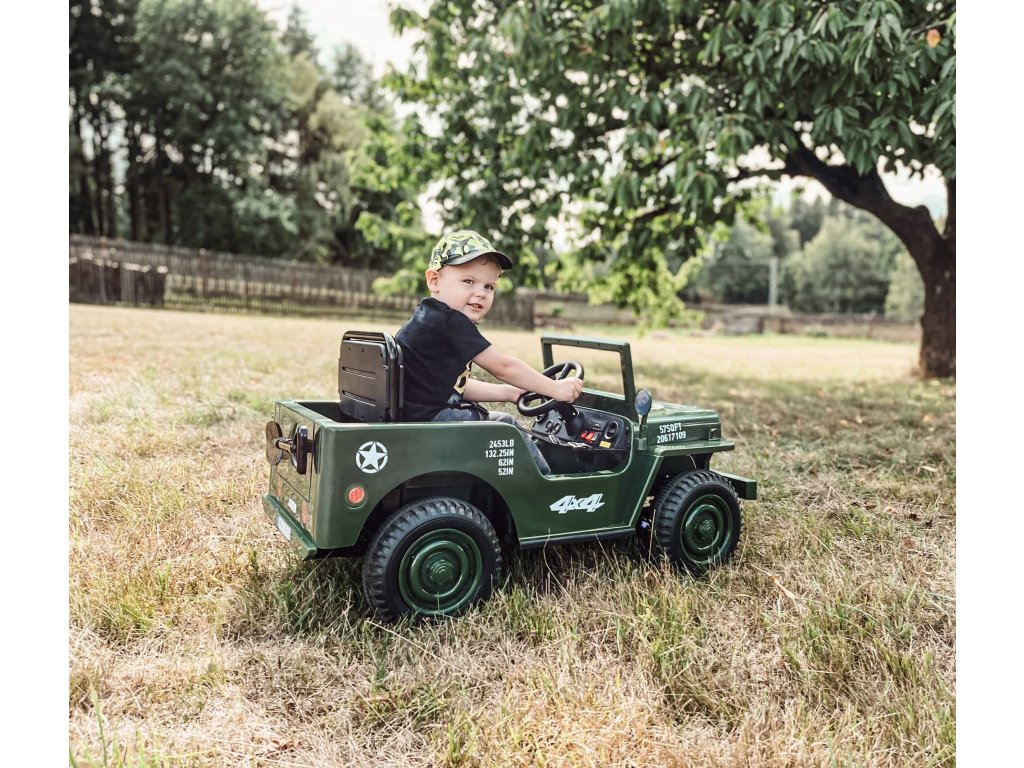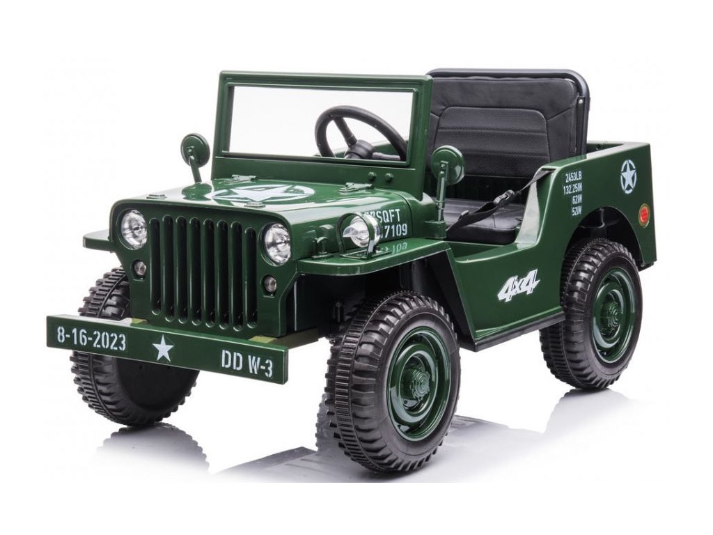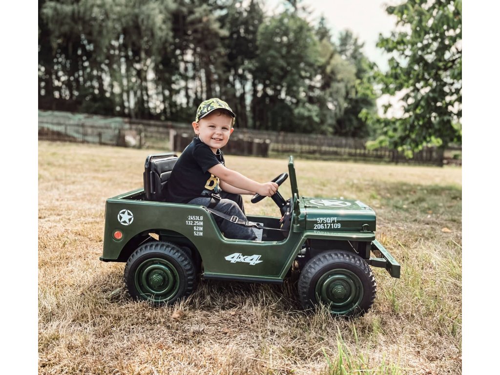 Dětský elektrický vojenský Jeep Willys 4x4 180W 12V7Ah EVA kola Army zelený