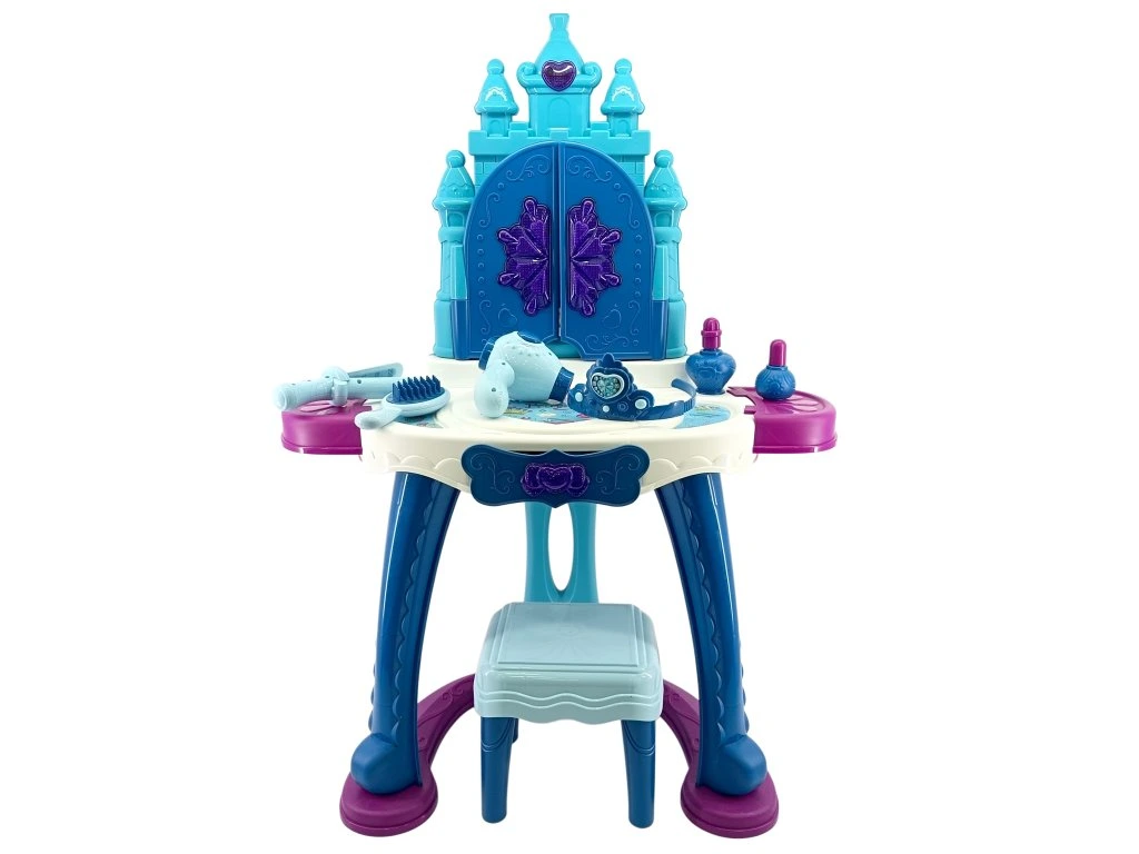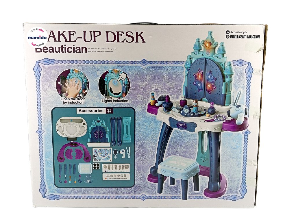 Toaletní stolek je vybaven velkým zrcadlem, které se po doteku rozzáří a otevře dvířka jako z pohádky. Bohaté příslušenství podporuje kreativní hru a rozvoj fantazie, zatímco stabilní konstrukce zajistí bezpečné používání. Součástí je i pohodlná stolička, na které může malá princezna při hraní sedět. Součástí balení je navíc 35 doplňků – hřebeny, fén, lahvičky na „parfémy“, tiára, šperky a další příslušenství, které dětem umožní napodobovat skutečné líčení a účesy.