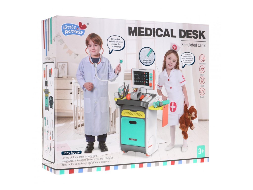 Lékařský vozík se zvukovými a svítícími efekty udělá radost všem dětem, kteří se chtějí stát doktory. Díky tomuto vozíku se vaše dítě bude moci otevřít svojí vlastní ordinaci. V balení se nachází spousta příslušenství jako je stetoskop, tlakoměr, teploměr a mnoha dalšího.