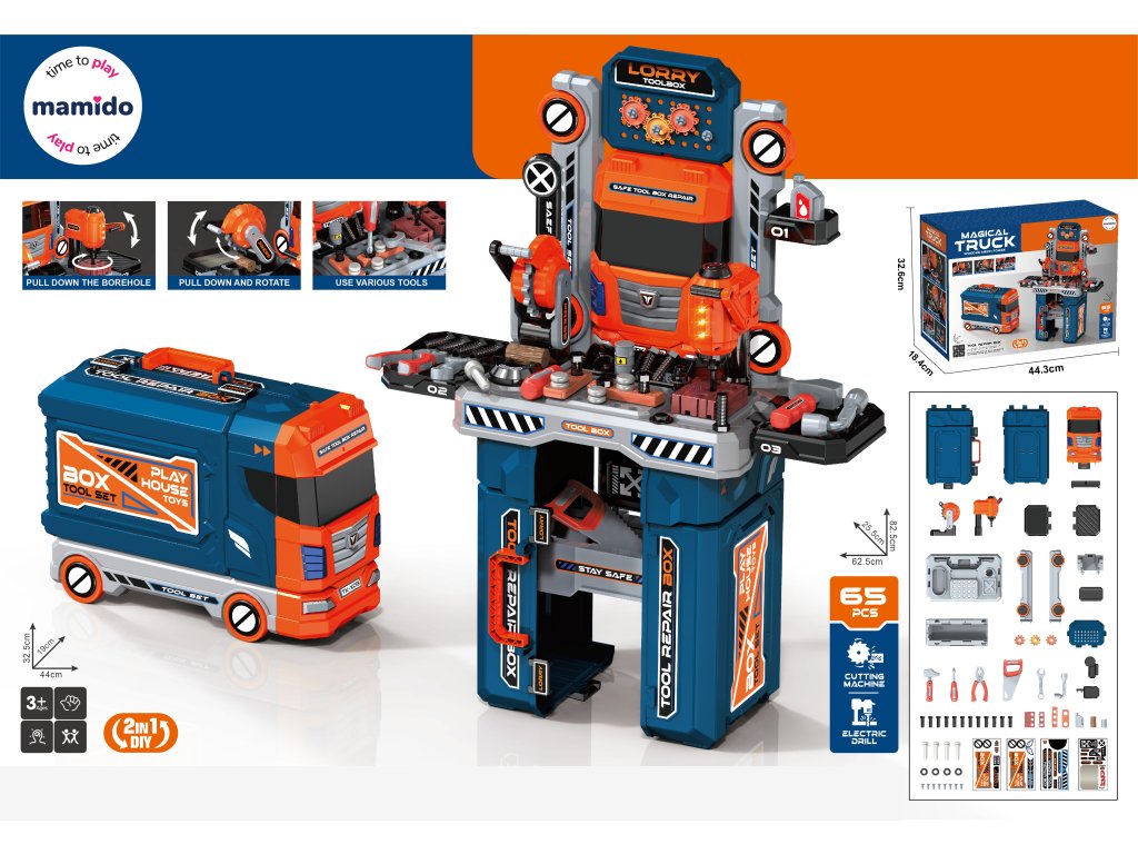Velký nákladní vůz 2v1, který se během chvilky promění v dílnu s pracovním stolem a nářadím. Skvělá hračka pro malé kutily, kteří rádi šroubují, opravují a zkoumají, jak věci fungují. Všechny díly se dají uložit přímo do kamionu, který slouží jako praktický kufřík na kolečkách s madlem pro snadné přenášení.