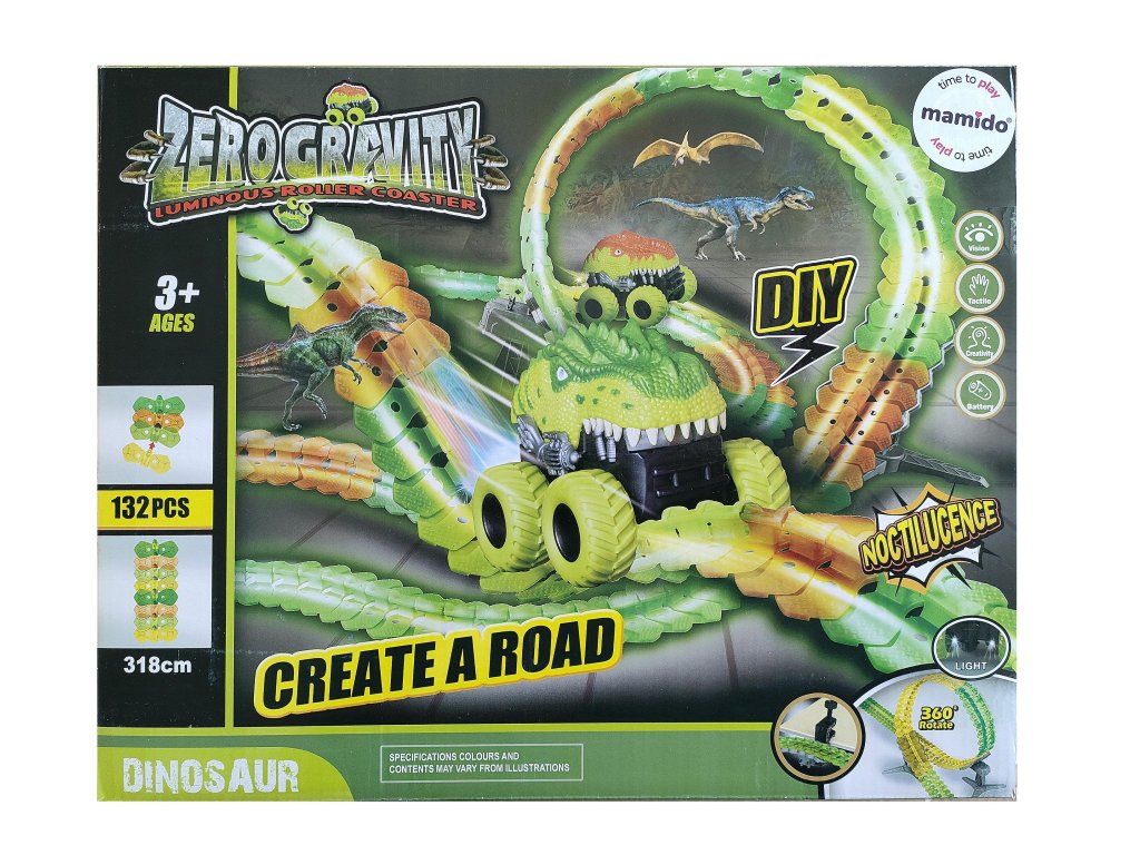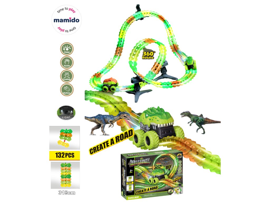 Barevná autodráha s dinosauřím autíčkem přinese dětem jedinečnou zábavu ve dne i v noci. Sada obsahuje 132 dílků dráhy o celkové délce až 318 cm, kterou lze sestavit do různých tvarů a smyček včetně 360° rotace. Speciální autíčko ve tvaru dinosaura se při jízdě rozsvítí a projíždí napínavou tratí plnou zatáček a mostů. Díky snadnému systému spojování si děti mohou vytvořit pokaždé jinou trasu a rozvíjet tak svou kreativitu a představivost.