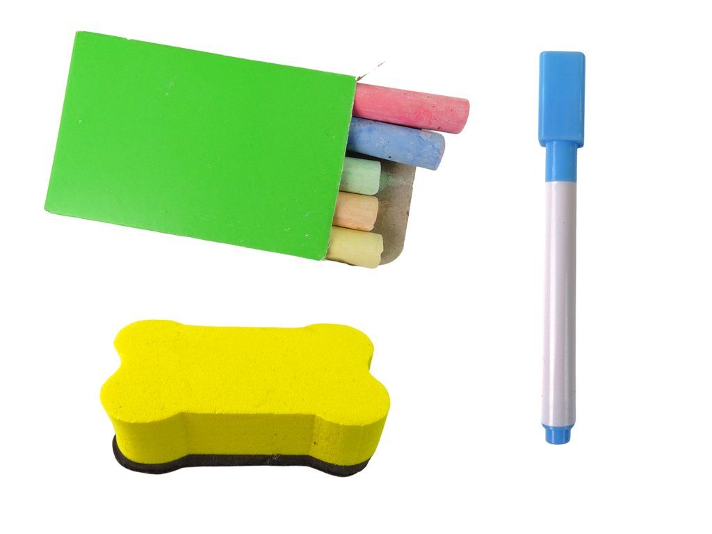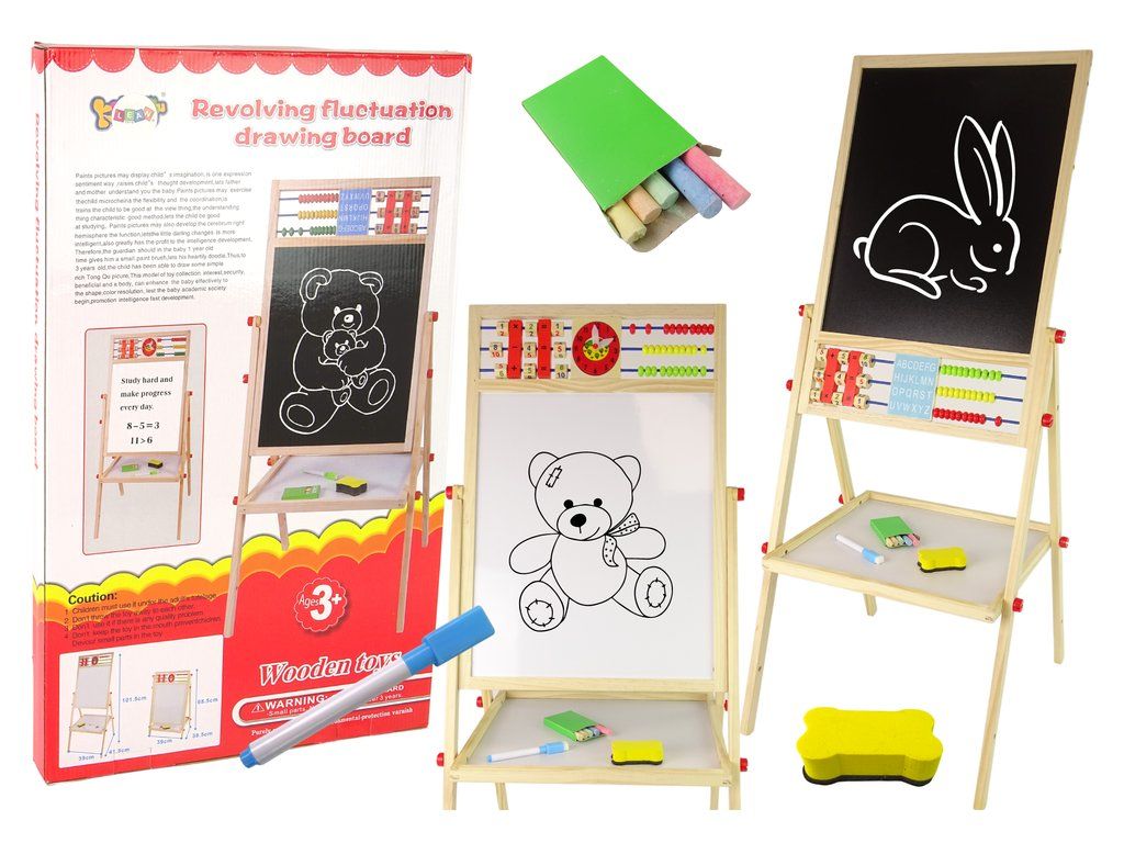 Tato oboustranná dětská tabule vyrobena z dřeva je ideální již od tří let věku. Je široce rozmístěná na nohách, což zajistí stabilitu a bezpečnost během hry. Pod tabulí se nachází polička pro křídu a houbičku. Jedna strana je klasická černá křídová tabule, na kterou můžete psát a kreslit křídou v několika barvách. Její povrch se jednoduše smývá pomocí houbičky z balení. Na druhé straně je magnetická bílá tabule.