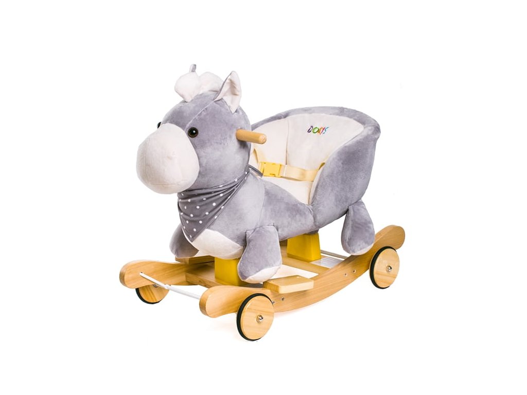 Dřevěná houpací hračka s kolečky je velmi pečlivě vyrobená s důrazem na každý malý detail. Konstrukce hračky je dřevěná, pečlivě obroušená a malovaná - žádné ostré hrany, takže hračka je 100% bezpečná. Ve střední části jsou umístěny podpěry, kde si dítě může s lehkostí položit nožičky. Jemný plyšový materiál způsobí, že se dítě nebude chtít pouze houpat, ale také rozvíjet smysl doteku.