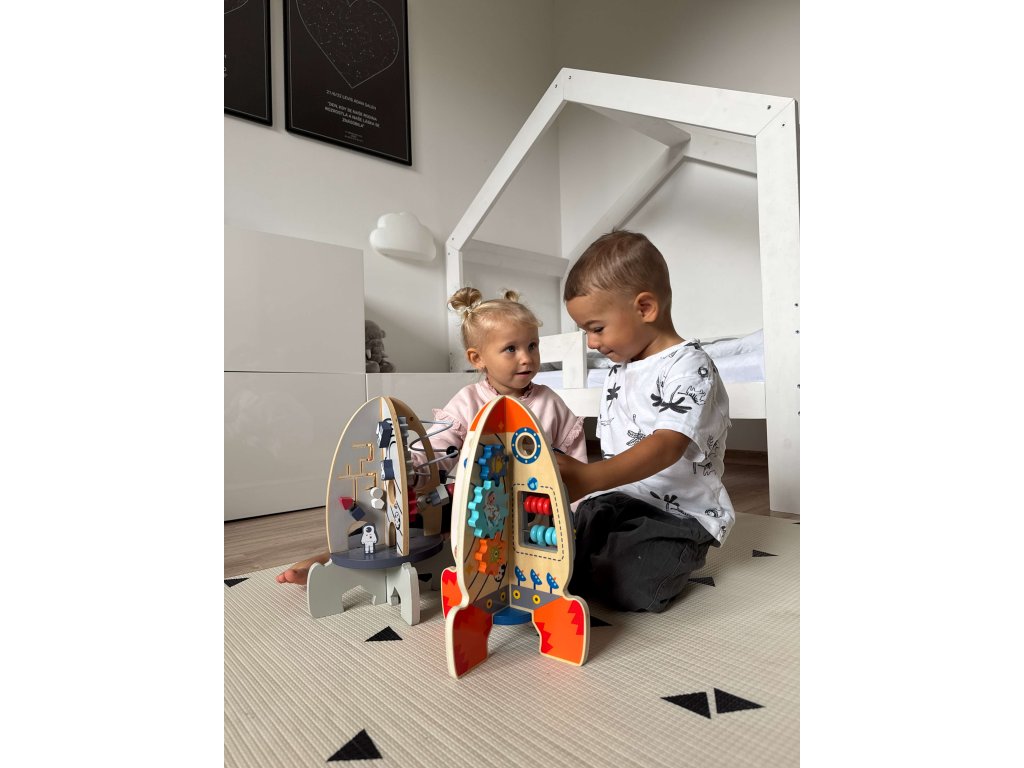 Připravte se na vesmírné dobrodružství s Dřevěnou vesmírnou raketou - Motorická hračka, ideální pro děti od 18 měsíců. Tato interaktivní hračka podporuje jemnou motoriku, koordinaci ruka-oko a logické myšlení. Hračka zahrnuje různé aktivity, jako jsou ozubená kola, korálky na drátech a další pohyblivé prvky. Vyrobena z bezpečných a ekologických materiálů, hračka je odolná a šetrná k dětské pokožce.